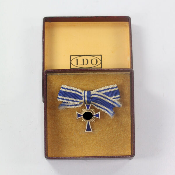 Miniatur Mutterkreuz in Gold an Schleife, Hst. L/11, im LDO Etui L/11