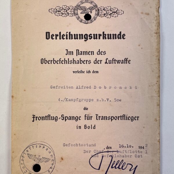 Verleihungsurkunde Frontflugspange für Transportflieger in Gold, Kampfgruppe z.b.V.
