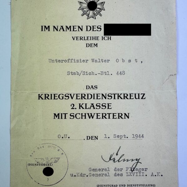 Urkunde Kriegsverdienstkreuz 2. Klasse mit Schwertern, Luftwaffe, General der Flieger Hellmuth Felmy