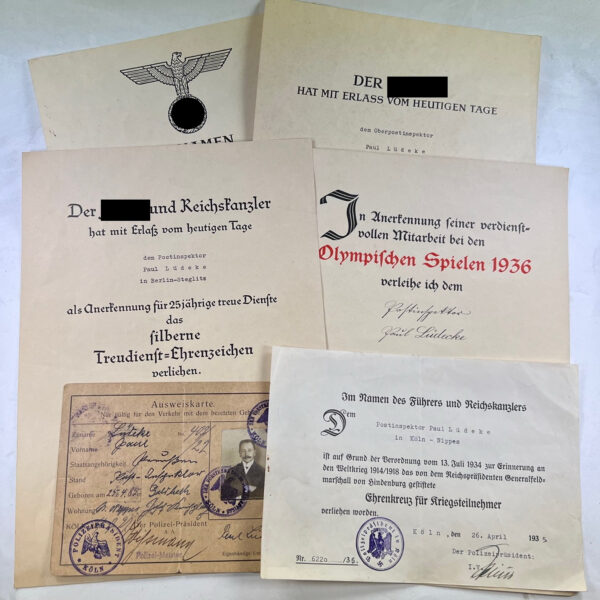 Urkunden Olympia Medaille, KVK Medaille, Treudienstehrenzeichen Silber u. Gold, etc.