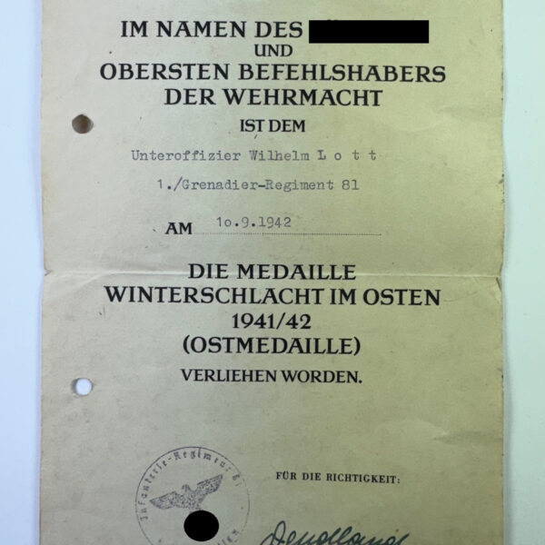 Urkunde Ostmedaille Grenadier-Regiment 81 (Medaille Winterschlacht im Osten 1941/42)