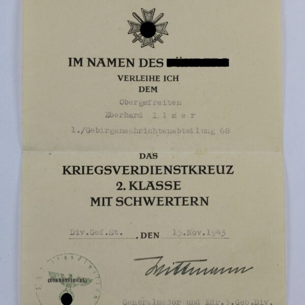 Urkunde Kriegsverdienstkreuz 2. Klasse mit Schwertern, Gebirgsjäger