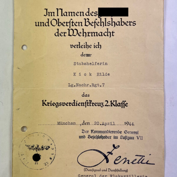 Urkunde Kriegsverdienstkreuz 2. Klasse an eine Frau (Stabshelferin) (!)