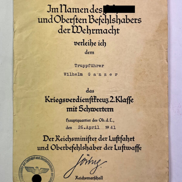 Urkunde Kriegsverdienstkreuz 2. Klasse m. Schwertern, Oberbefehlshaber der Luftwaffe