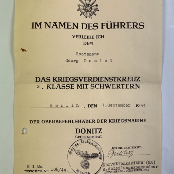 Urkunde Kriegsverdienstkreuz 2. Klasse mit Schwertern, Kriegsmarine