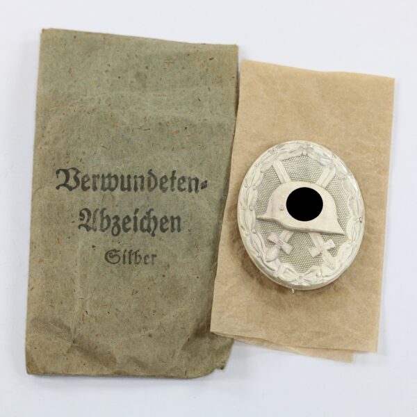 Verwundetenabzeichen in Silber, Hst. 127, in Verleihungstüte Moritz Hausch AG, Pforzheim