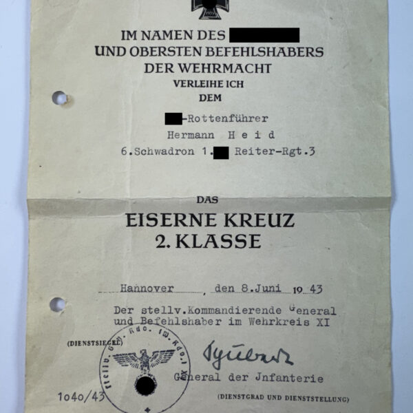 Urkunde Eisernes Kreuz 2. Klasse 1939, SS Reiter Regiment 3