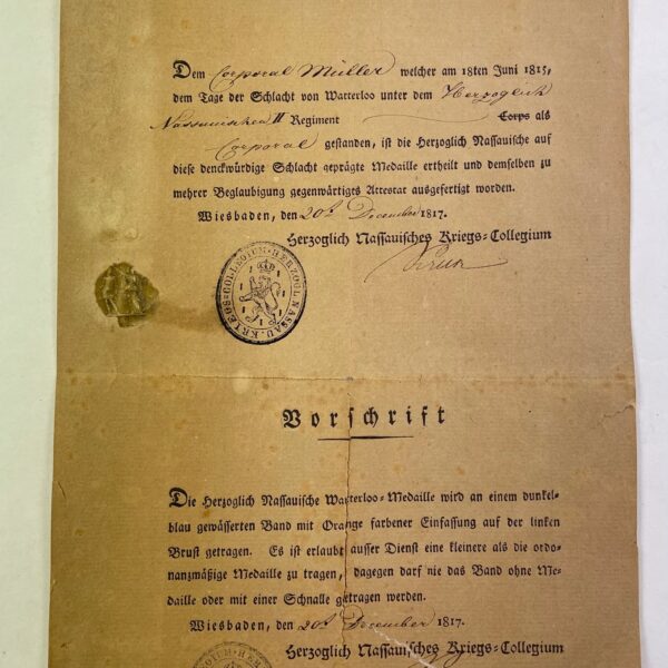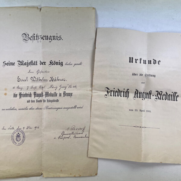 Besitzzeugnis Friedrich-August Medaille in Bronze + Urkunde über die Stiftung