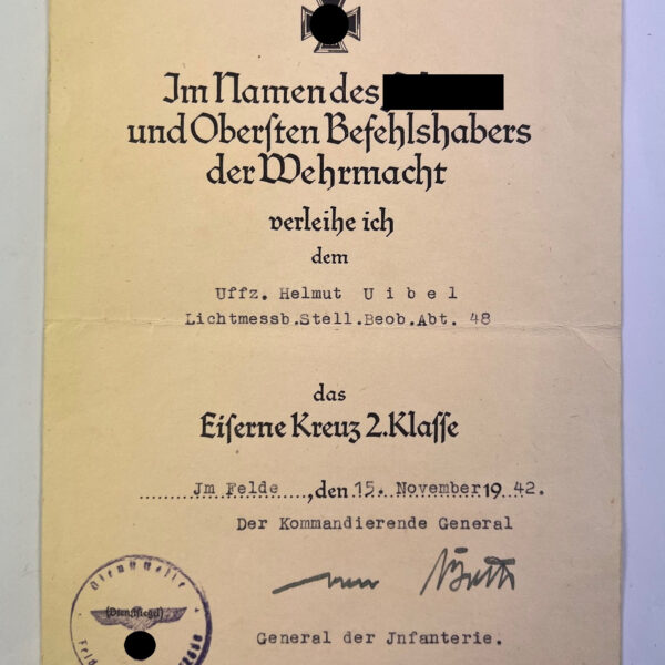 Urkunde Eisernes Kreuz 2. Klasse 1939, Lichtmessb. Stell. Beob.Abt. 48