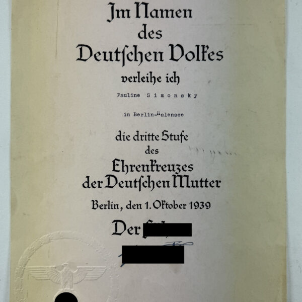 Mutterkreuz in Bronze, in Verleihungstüte Lind & Meyrer Oberstein/Nahe