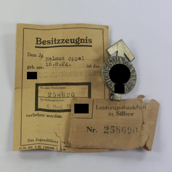 HJ Leistungsabzeichen in Silber + Urkunde + Verleihungstüte, nummerngleich (!)