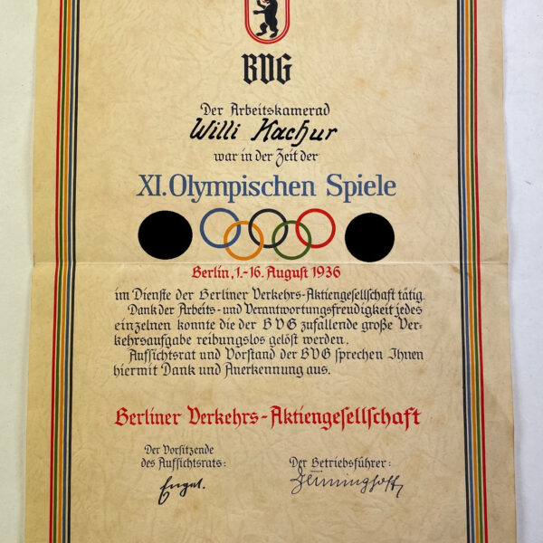 Olympiade 1936 Berlin, Ehrenurkunde der Berliner Verkehrsaktiengesellschaft (BVG)