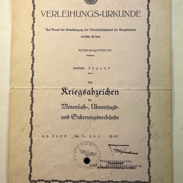 Verleihungs-Urkunde Kriegsabzeichen Minensuch-, U-Bootsjagd- und Sicherungsverbänden