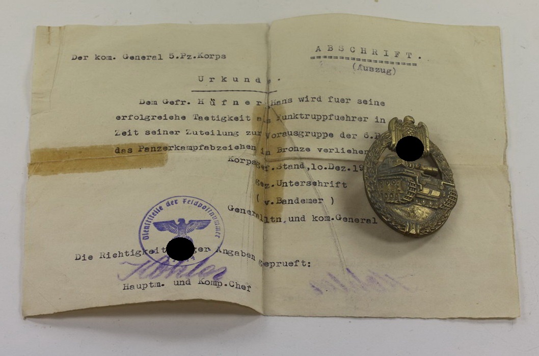 Panzerkampfabzeichen in Bronze, Alois Rettenmaier, Schwäbisch Gmünd + Urkunde