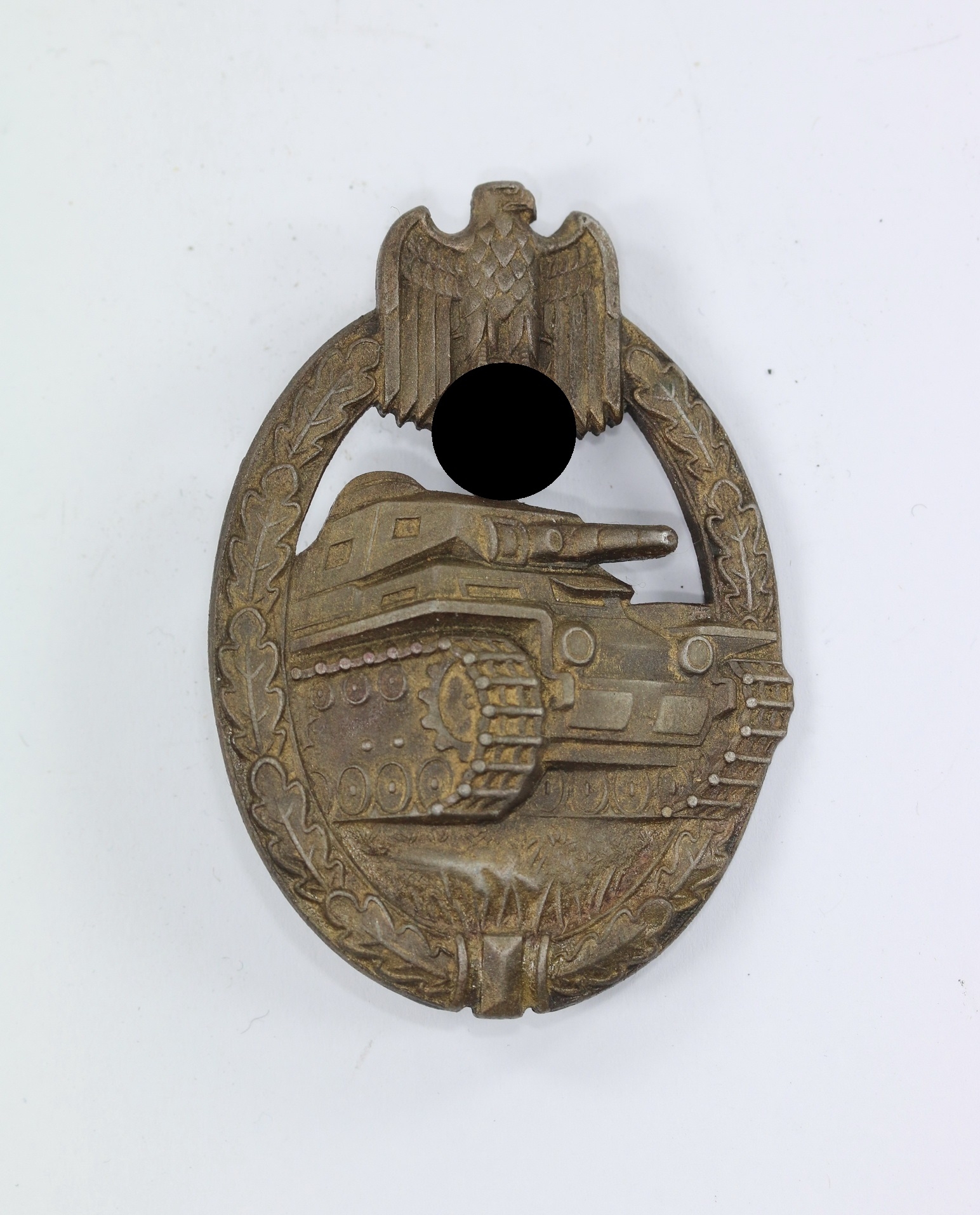 Zinc based and in an excellent, probably unworn condition with all of the bronze wash still present. Not marked but a known variation. See Philippe de Bock, The German Panzer Assault Badge.