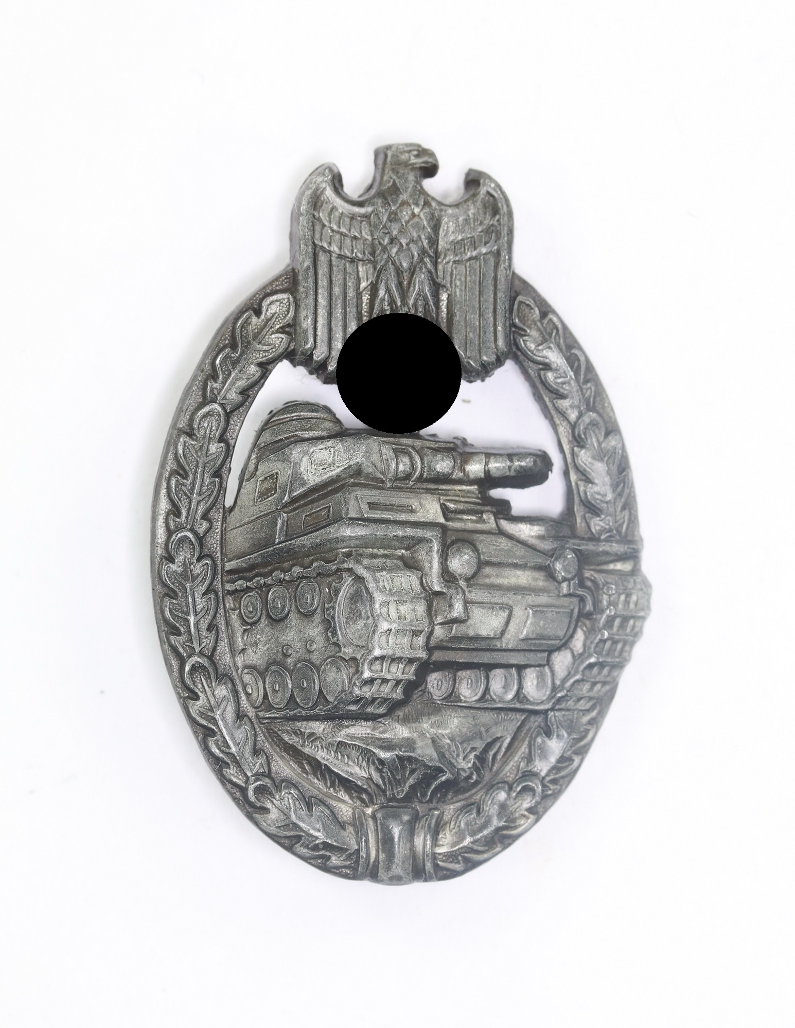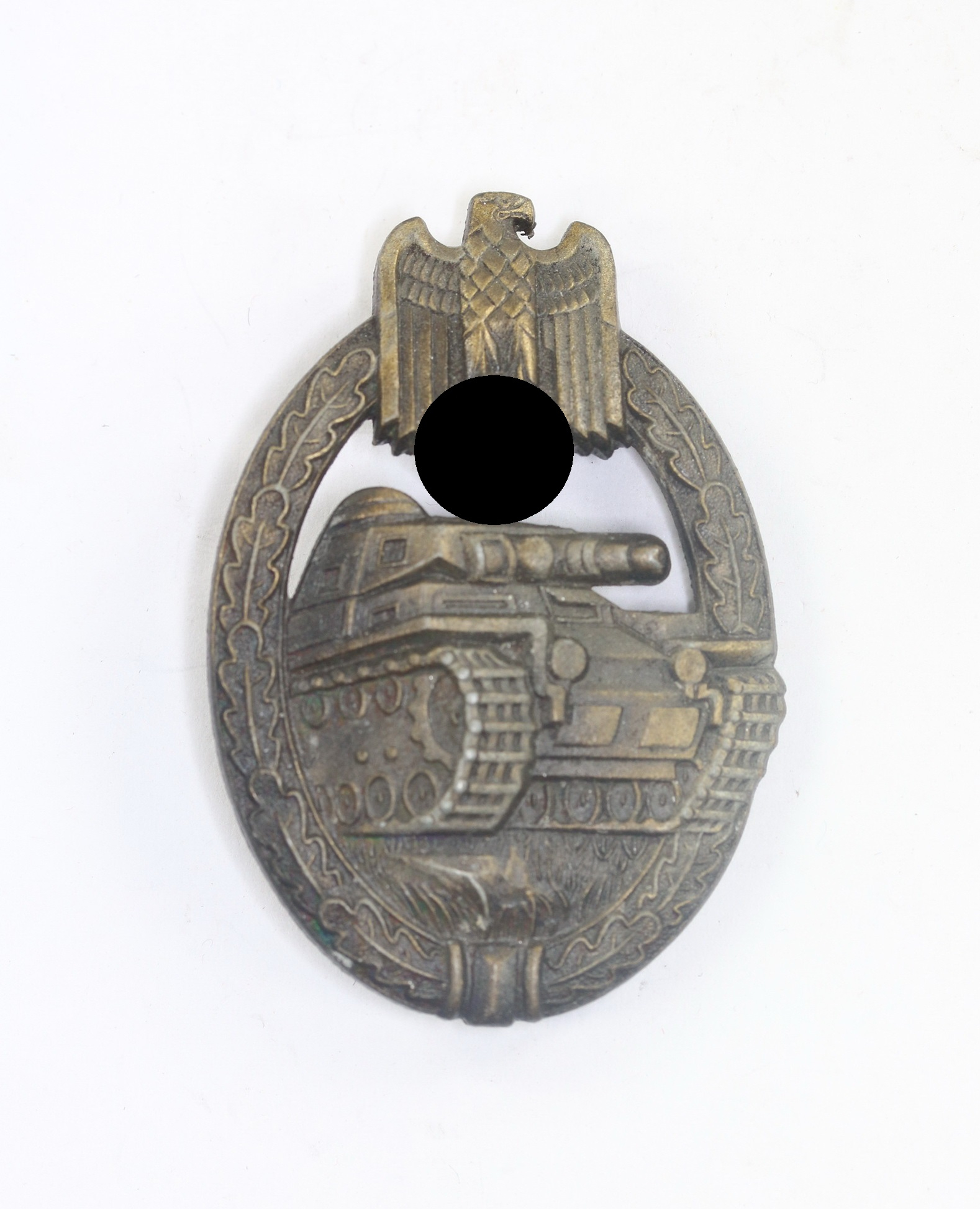 Zink, sehr guter, nur minimal getragener Zustand. Mit fast vollständiger Bronzierung. Ohne Hersteller, aber eine bekannte Variante, der Firma Wilhelm Deumer, Lüdenscheid. Siehe Philippe de Bock, The German Panzer Assault Badge.