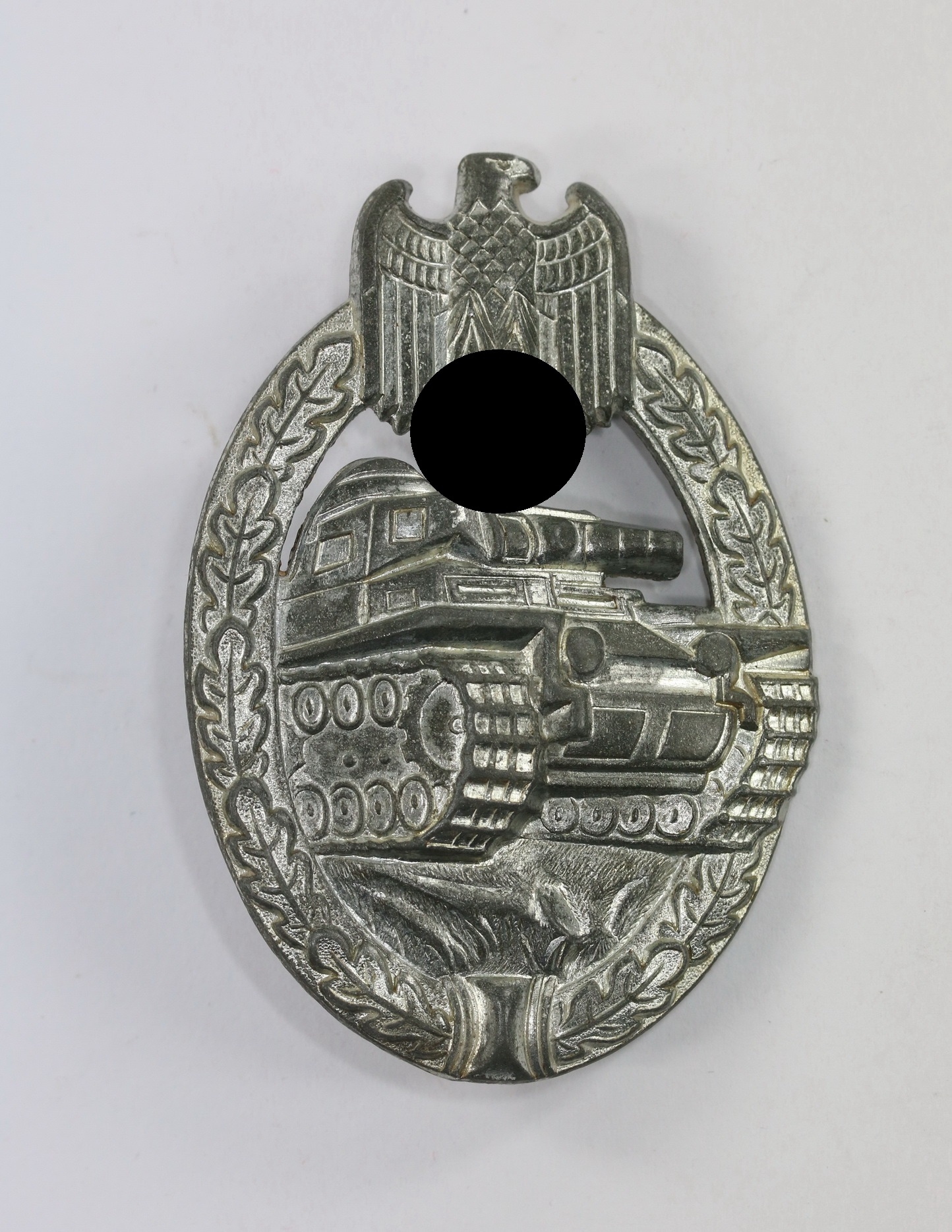 Zink, sehr guter, ungetragener Zustand. Mit vollständiger, typischer chromartiger Versilberung. Ohne Hersteller, aber eine bekannte Variante der Firma Franke & Co., Lüdenscheid (FCL). Siehe Philippe de Bock, The German Panzer Assault Badge.