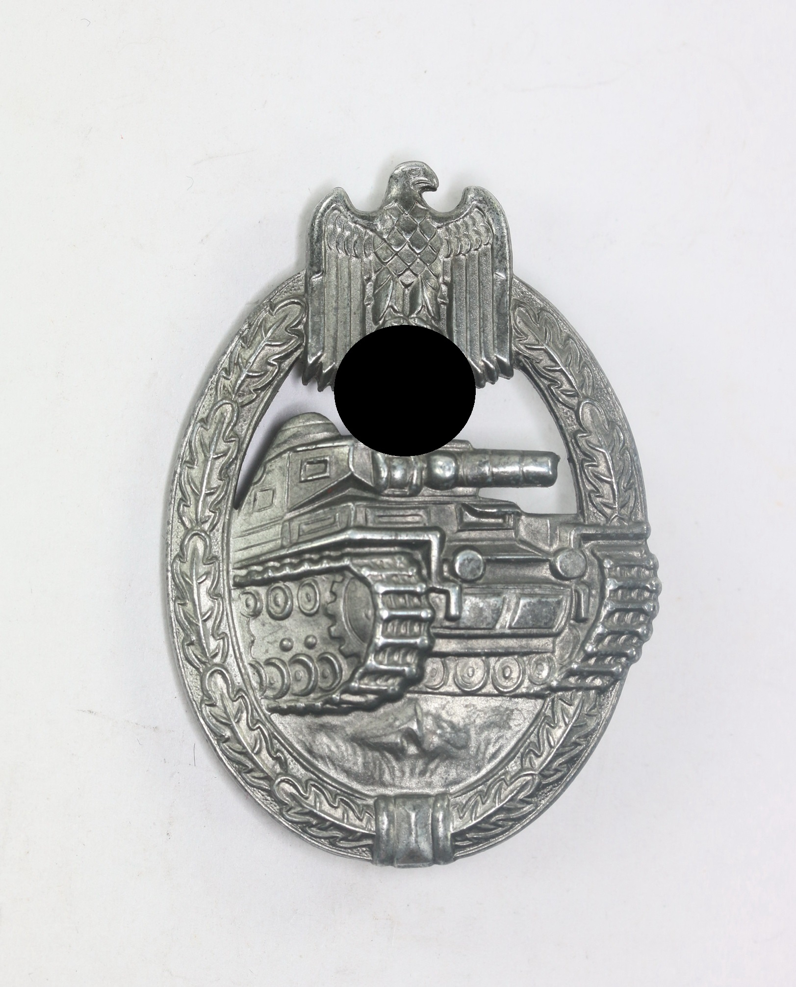 Zink, sehr guter, leicht getragener Zustand. Mit vollständiger Versilberung. Ohne Hersteller, aber eine bekannte Variante der Firma Frank & Reif, Stuttgart. Siehe Philippe de Bock, The German Panzer Assault Badge.