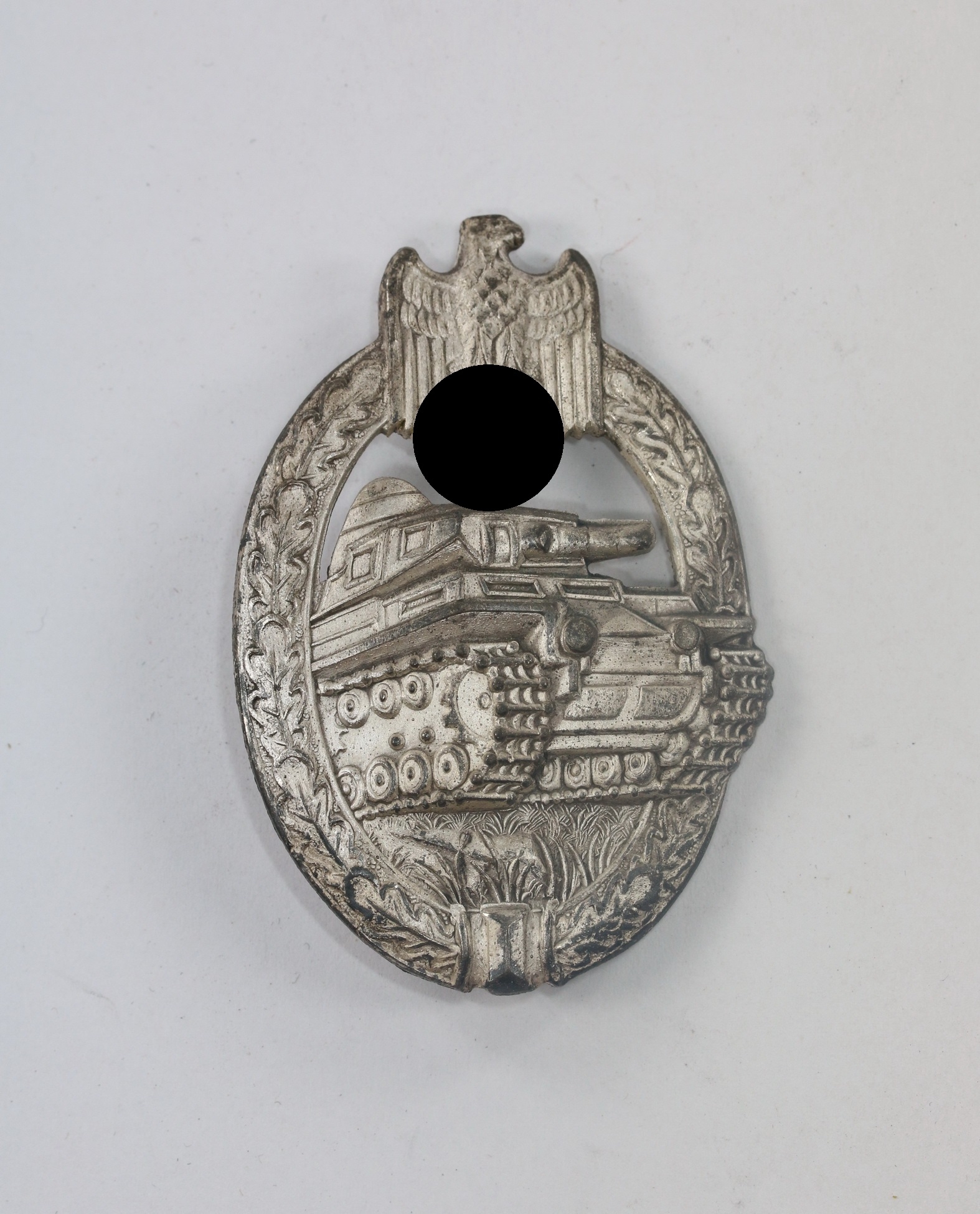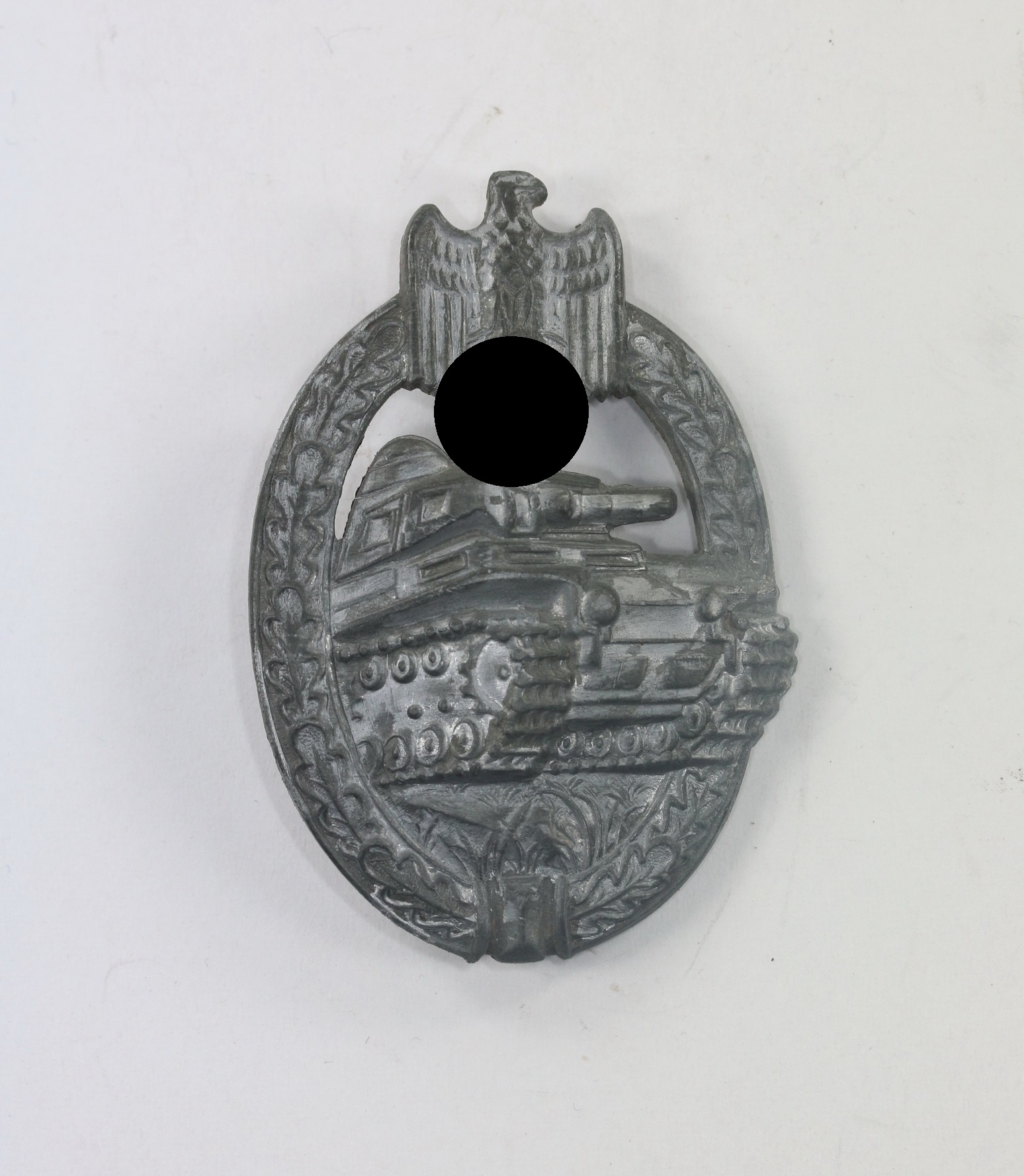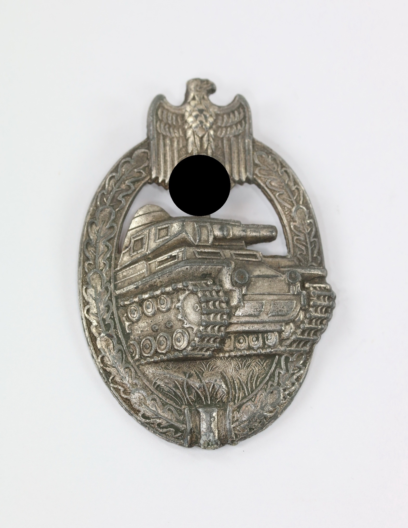 Zink, sehr guter, nahe zu ungetragener Zustand. Mit vollständiger, typischer Versilberung. Mit Hersteller Logo „AS“ im Dreieck, eines unbekannten Herstellers. Siehe Philippe de Bock, The German Panzer Assault Badge.