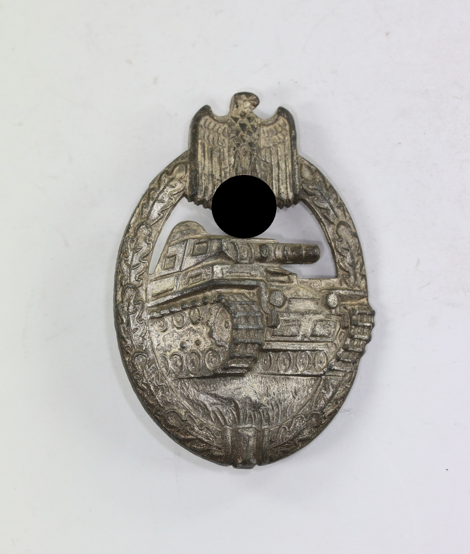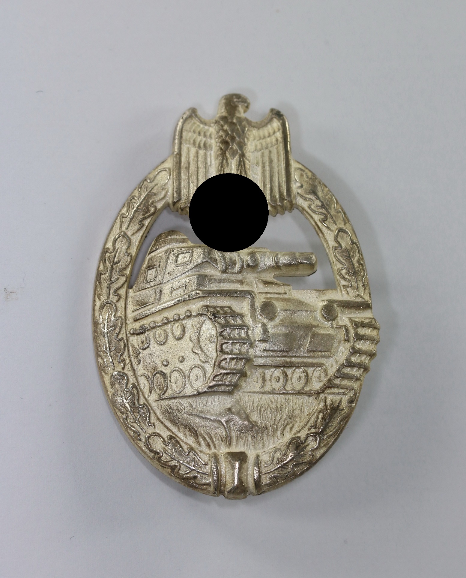 Zink, sehr guter, nur leicht getragener Zustand. Mit fast vollständiger Versilberung, mit leichten Ansätzen von Patina. Mit Hersteller „KWM“ für die Firma Karl Wurtser, Markneukirchen. Siehe Philippe de Bock, The German Panzer Assault Badge.
