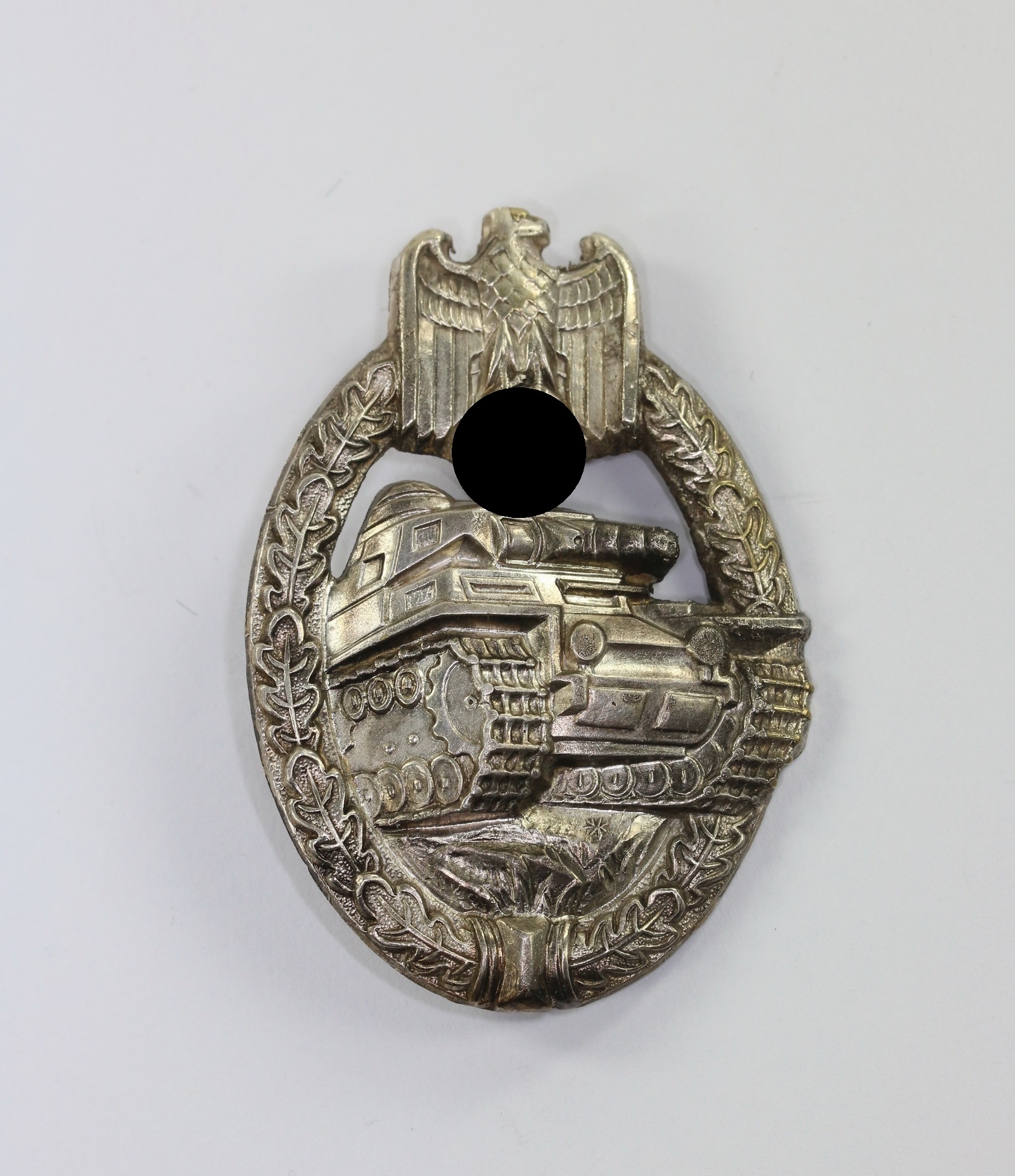 Buntmetall, sehr guter, nur minimal getragener Zustand. Mit vollständiger Versilberung, Hakenkreuz und Kanten poliert. Mit leichter, unberührter Patina. Ohne Hersteller, aber eine bekannte Variante der Firma Schauerte & Hohfeld Lüdenscheid. Siehe GCA-Datenbank.