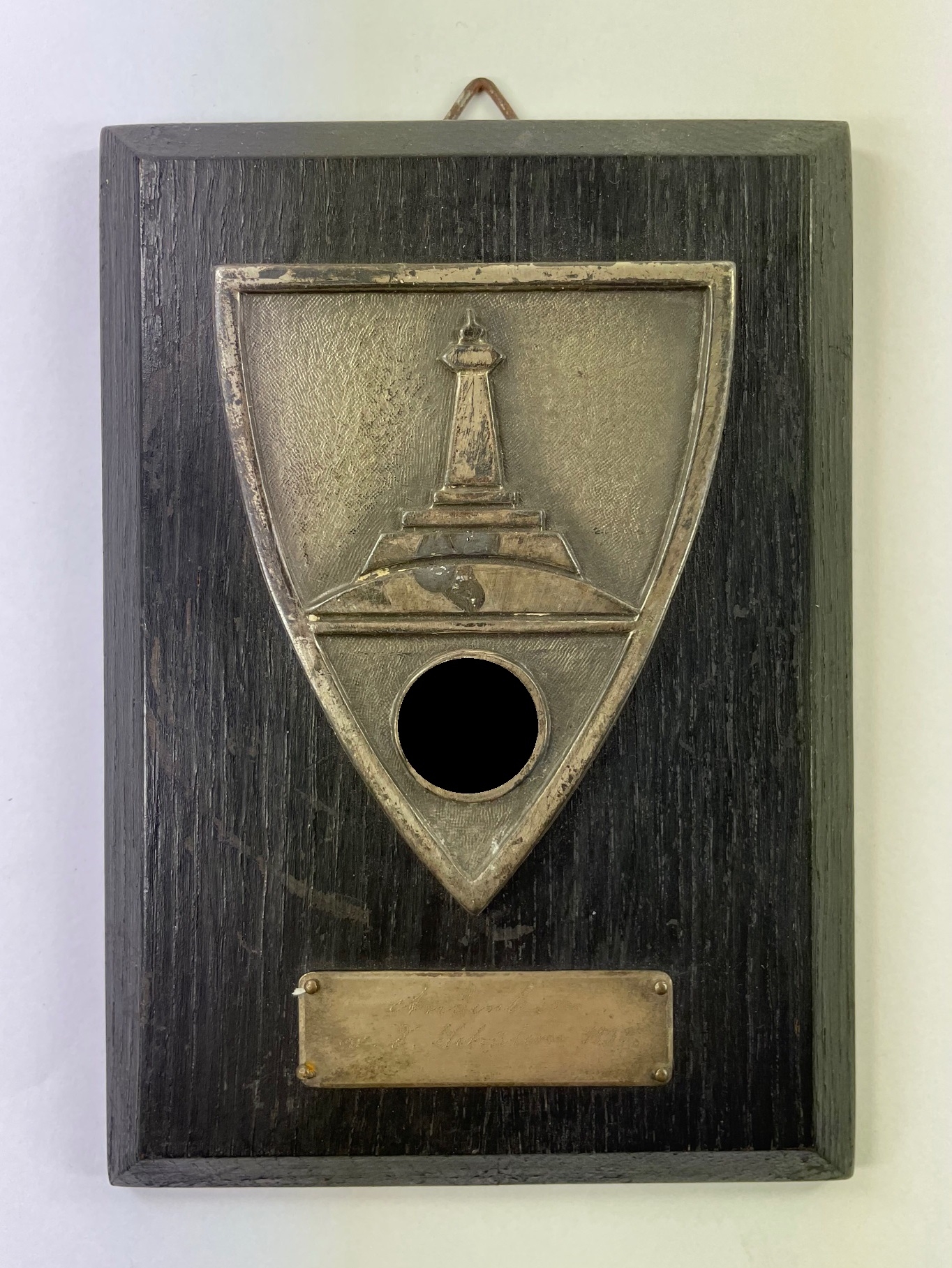 In a very good, slightly used condition. Black wood with metal device and engraved dedication plate. The reverse to hang on the wall. Size approx. 11,5 x 15 cm.