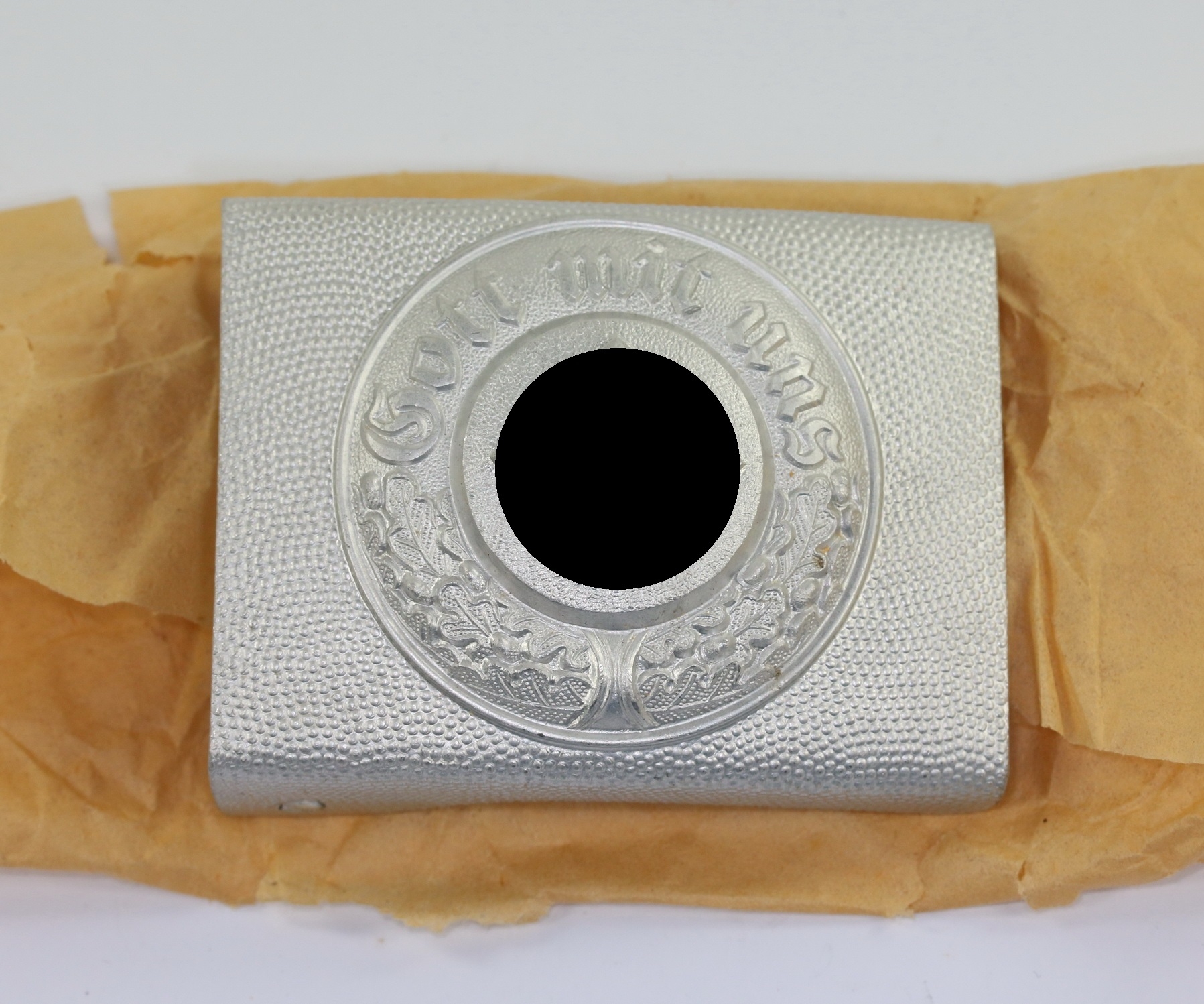 Aluminium, durchgeprägt, excellenter, absolut ungetragener Zustand. Noch in den originalen Packpapier! Mit Hersteller „G.G.L.“ für die Firma Gebrüder Glörfeld, Lüdenscheid.