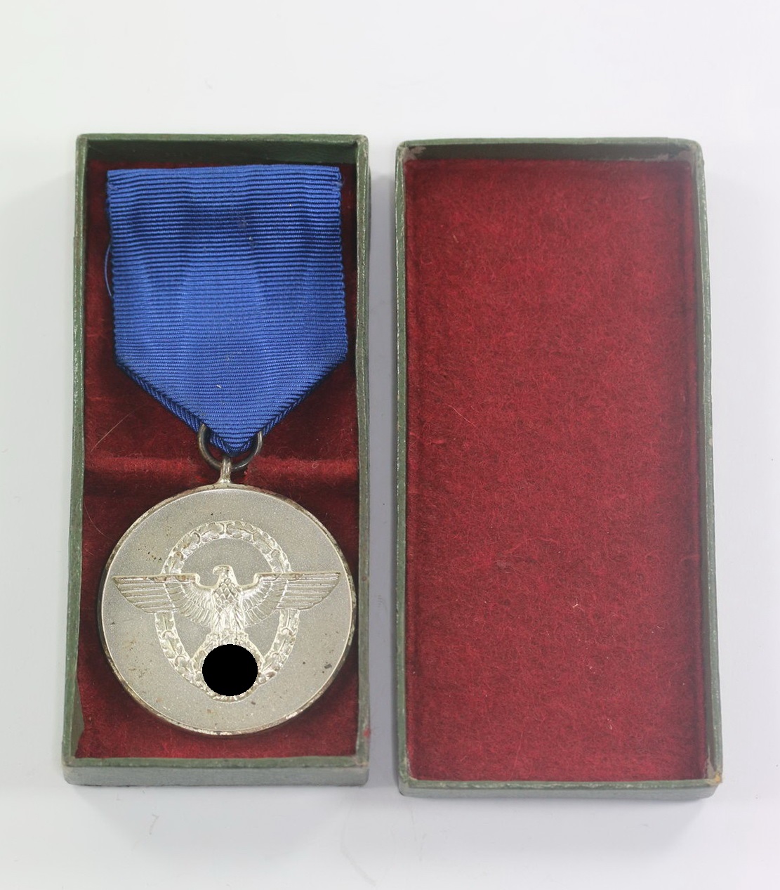 Buntmetall versilbert, sehr guter, ungetragener Zustand. Mit vollständiger Versilberung. Auf der Vorderseite der Polizeiadler, Rückseitig zentral eine „8“, darum „Für treue Dienste in der Polizei“Am blauen Band mit vernähter Tragenadel.