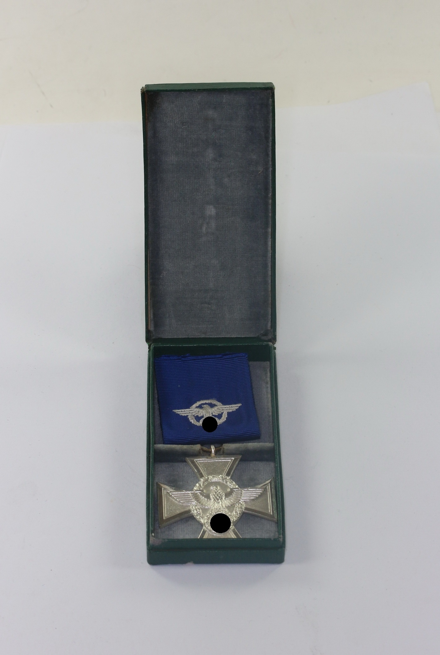 Not marked but a known variation. The blue ribbon with yellow embroided police type eagle.