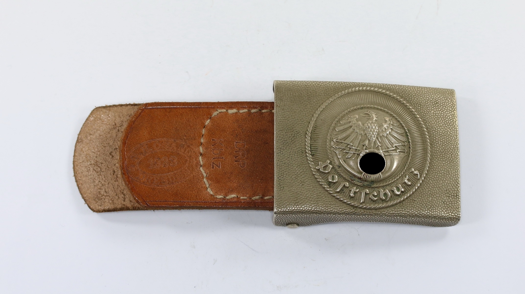 Nickle silver based and in an excellent, unworn condition. Complete with the the leather tongue. Embossed in to the leather with the maker „G.H. Osang Dresden“, the year“1933″, and „DRP“ standing for Deutsche Reichs Post. Also „Kblz“ for Koblenz.