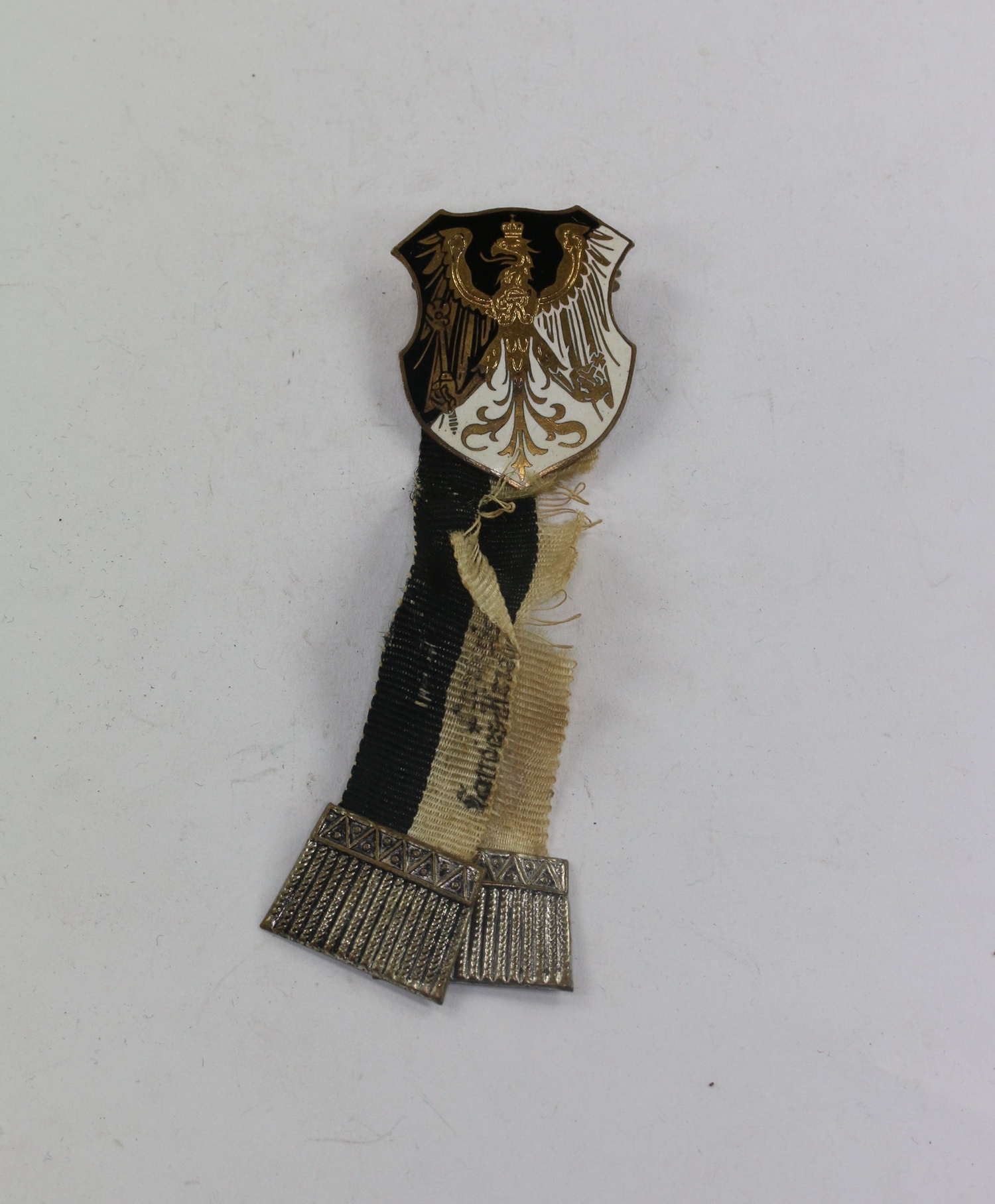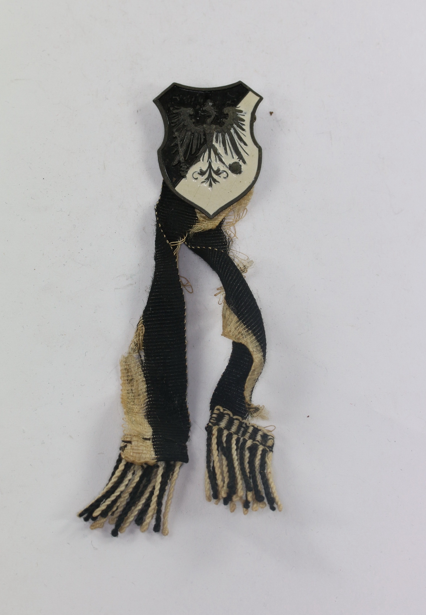 Painted type and in a very good, slightly worn condition. The print on the ribbon unreadable.