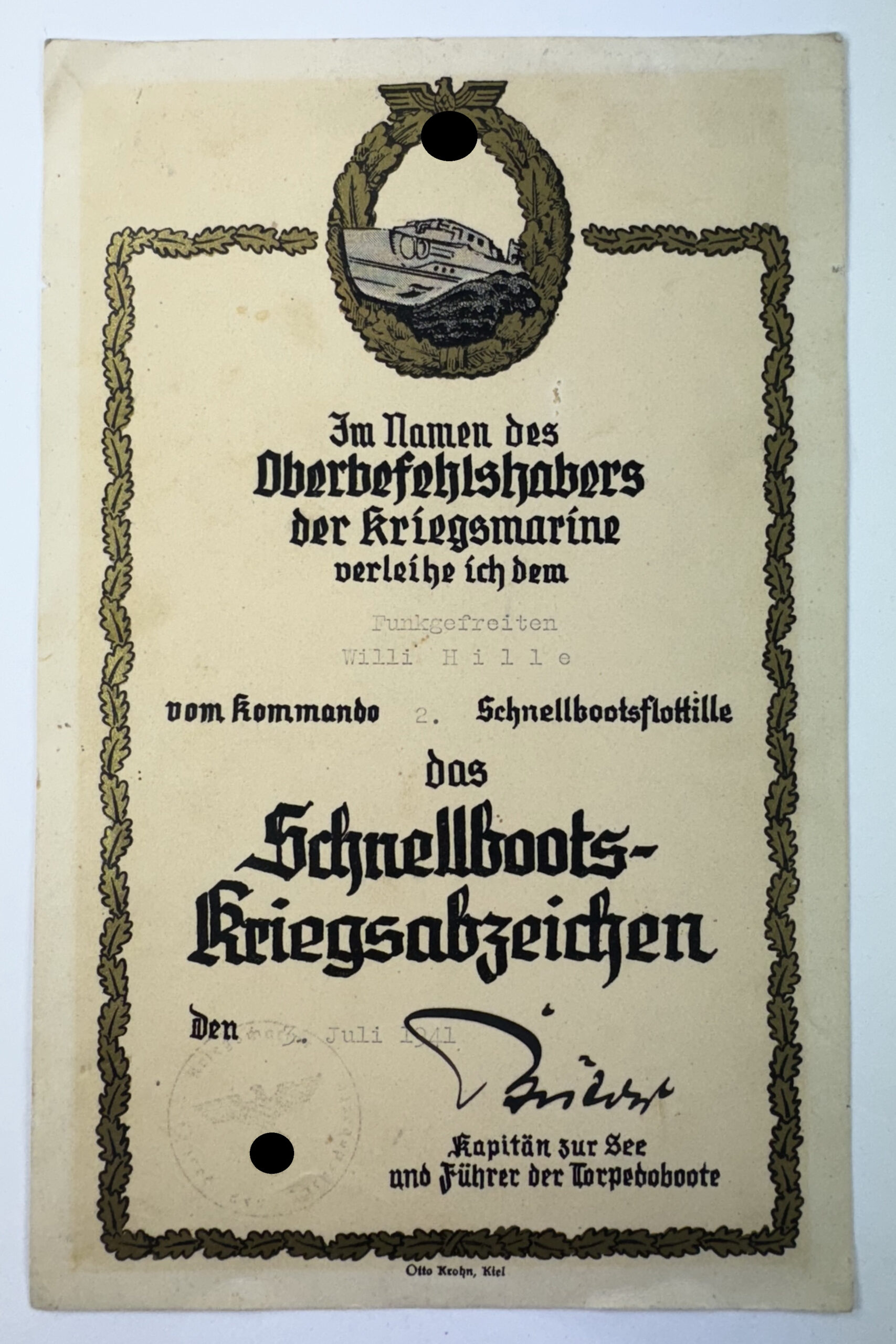 Schmuckurkunde Schnellbootskriegsabzeichen 1. Form, 2. Schnellbootflotille
