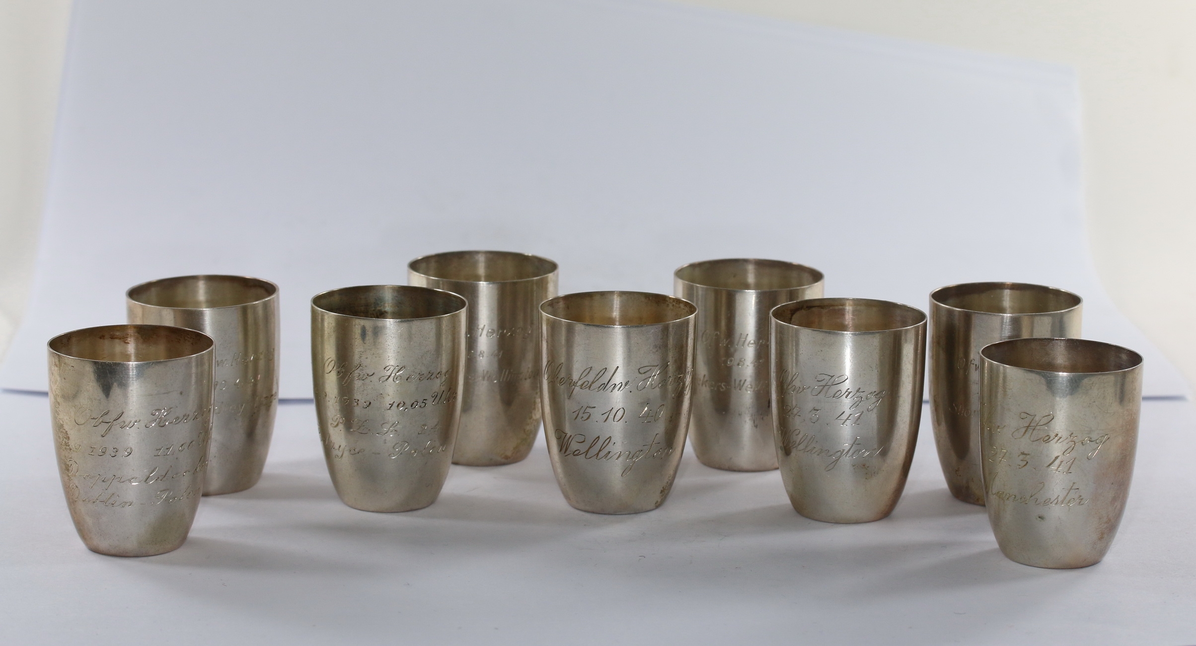 A set of nine victory cups from the possessions of Stabsfeldwebel Herzog. Herzog served first of all with Zerstörer Geschwader 26 (ZG 26), and then later with the 2. Gruppe of Nachtjagd Geschwader 1, (NJG 1). He was killed in action on 20. Oktober 1943.