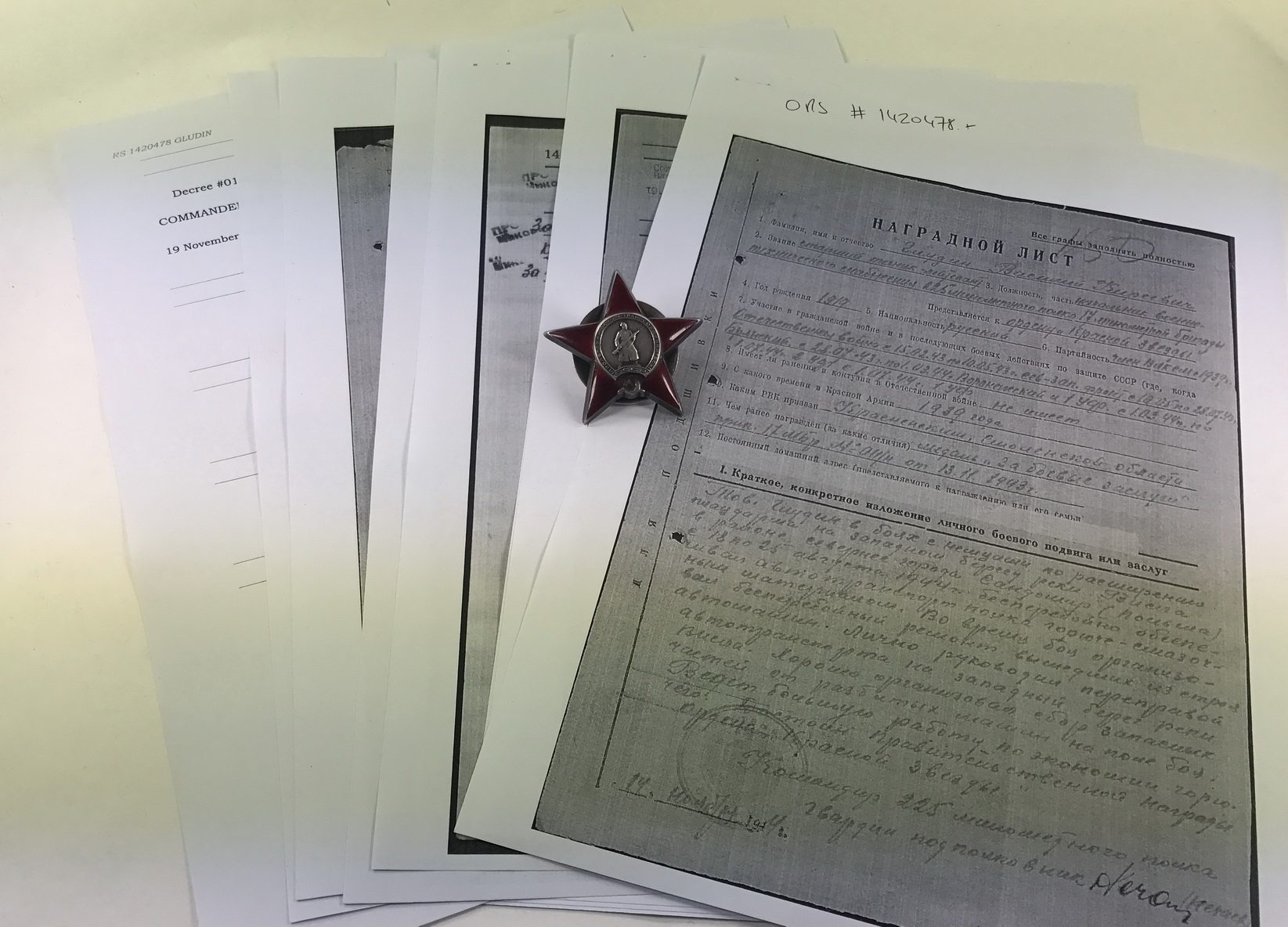 Mommy mit Forschungsmaterial aus dem russischen Archiv Bestehend aus Registerkarte, Auszeichnungsliste, Dekret und Verleihungsvorschlag..