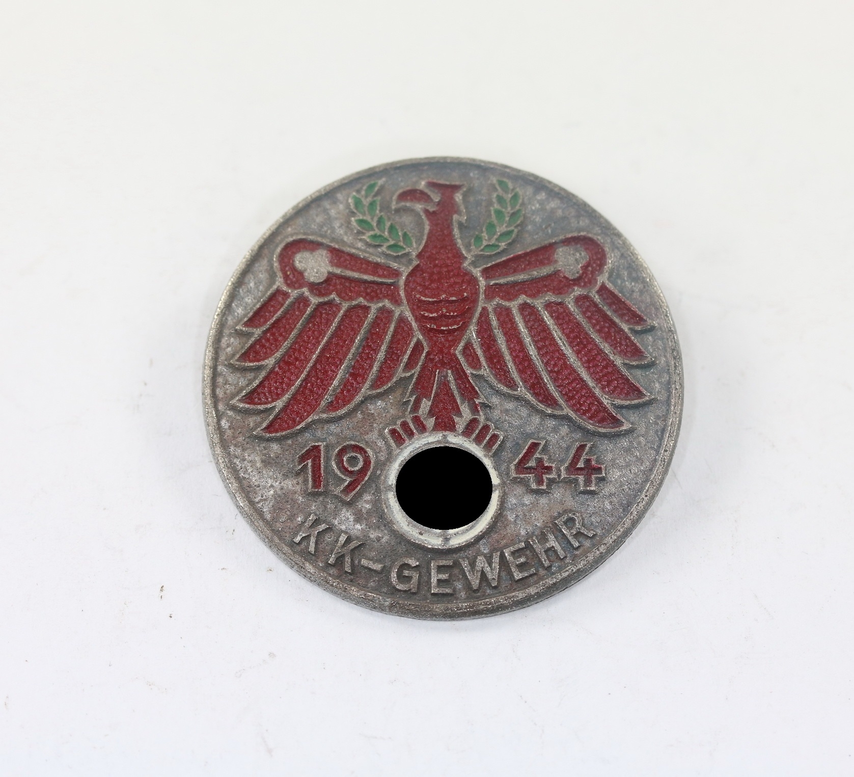 Zink versilbert, teilweise lackiert. Sehr guter, nur minimal getragener Zustand. Die Versilberung vollständig vorhanden. 40 mm Ausführung. Rückseitig „Ges. Gesch.“.