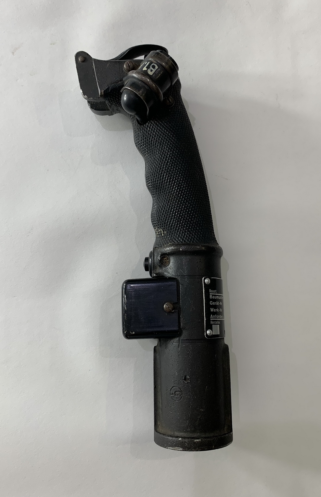 In a very good, slightly used condition. With type shield „ngk“ the code for Luftfahrt-Apparatebau G.m.b.H., Berlin. „Baumuster KG13A Gerär-Nr.:102-288 A Werk-Nr. 10609 Anforderz. Fi 47915“. Complete with the attached box for the cables (V23), complete with the plan of the electrics KG 13. Top the button for the radio. The fish skin binding with some wear but complete and undamaged. The front with two buttons for machine gun and cannon.