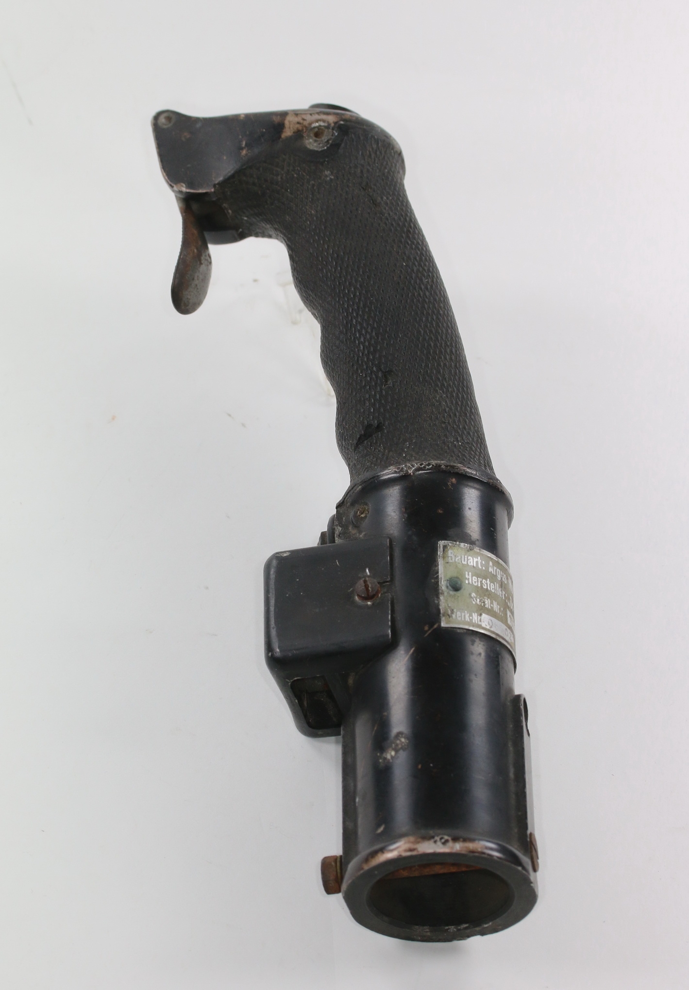 In a very good, slightly used condition. With type shield „Bauart: Argus Motoren G.M.B.H. Hersteller: „Original Bruhn“ Gerär-Nr.: 102-56 E BAL 802 Werk-Nr. 06802 FL- Nr. 47945″. With attached box for the complete cable attachments, above that the button for the radio. The fish skin covering complete and only showing only minimal wear.. on top of the grip the buttons for the cannon and machine guns.