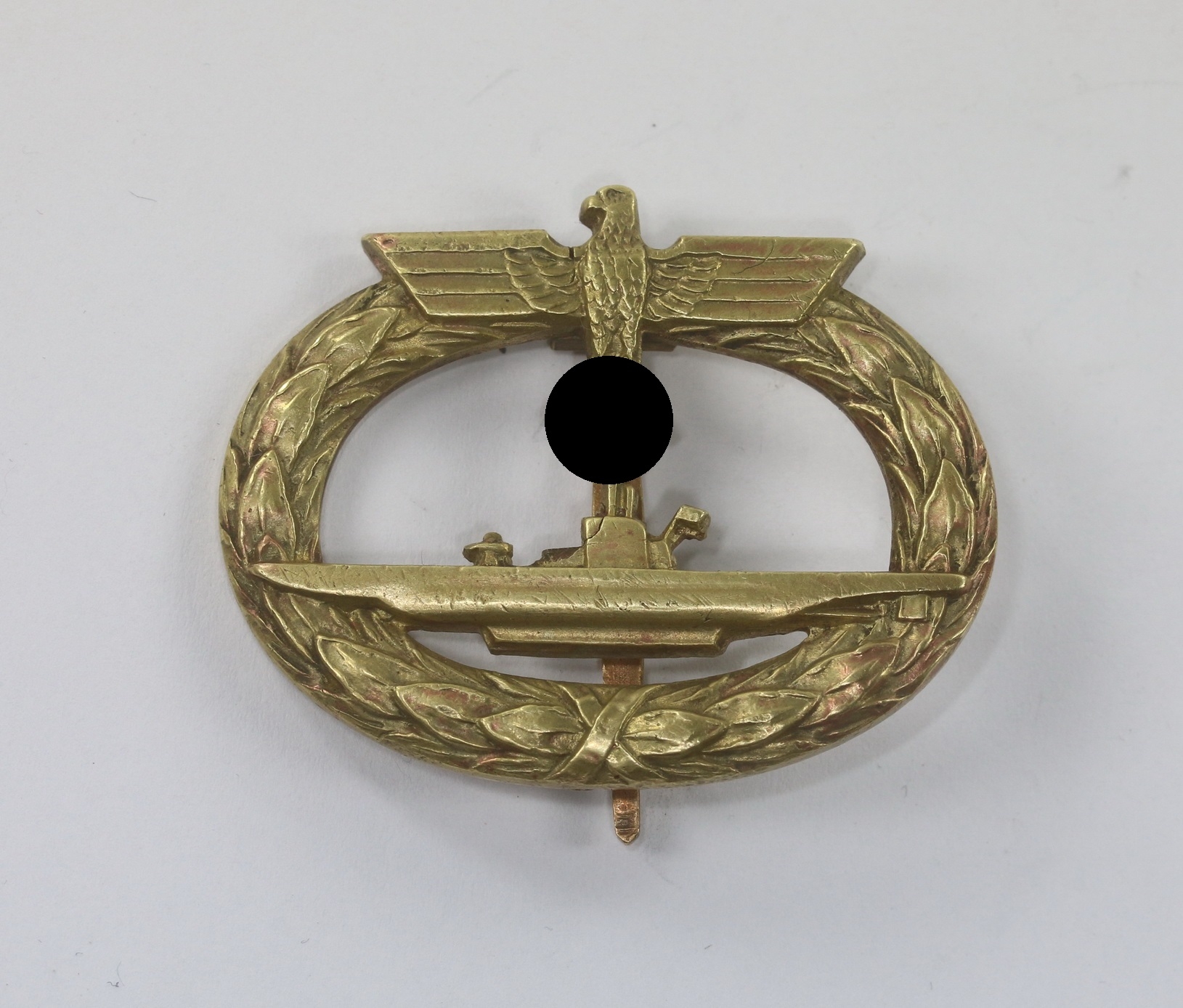 Buntmetall, vergoldet, sehr guter, leicht getragener Zustand. Mit vollständiger Vergoldung. Hakenkreuz und Kanten poliert. Mit leichter Patina. Mit Hersteller „Schwerin Berlin68“. Siehe Weber/Skora, Die Kriegsabzeichen der Kriegsmarine.