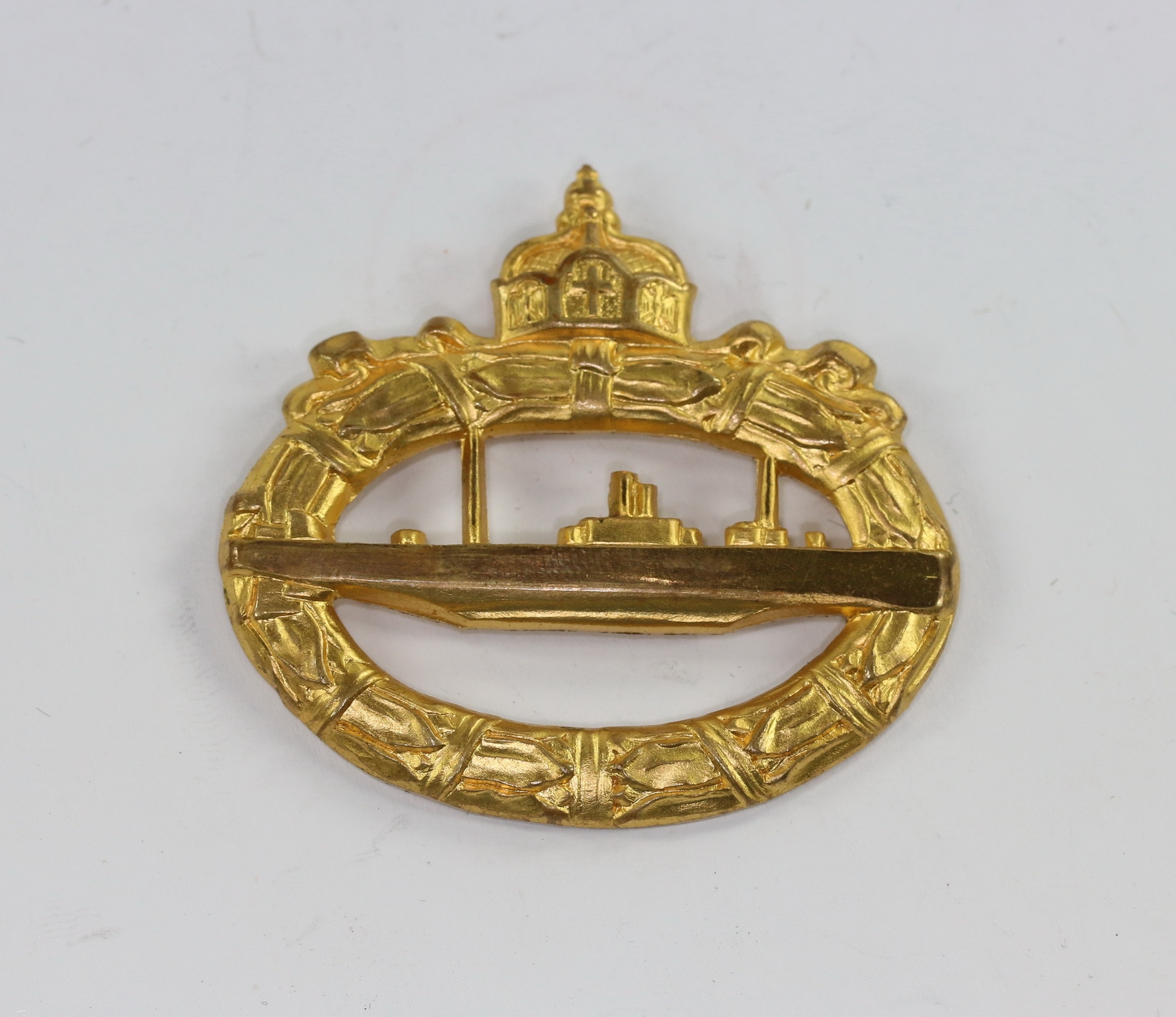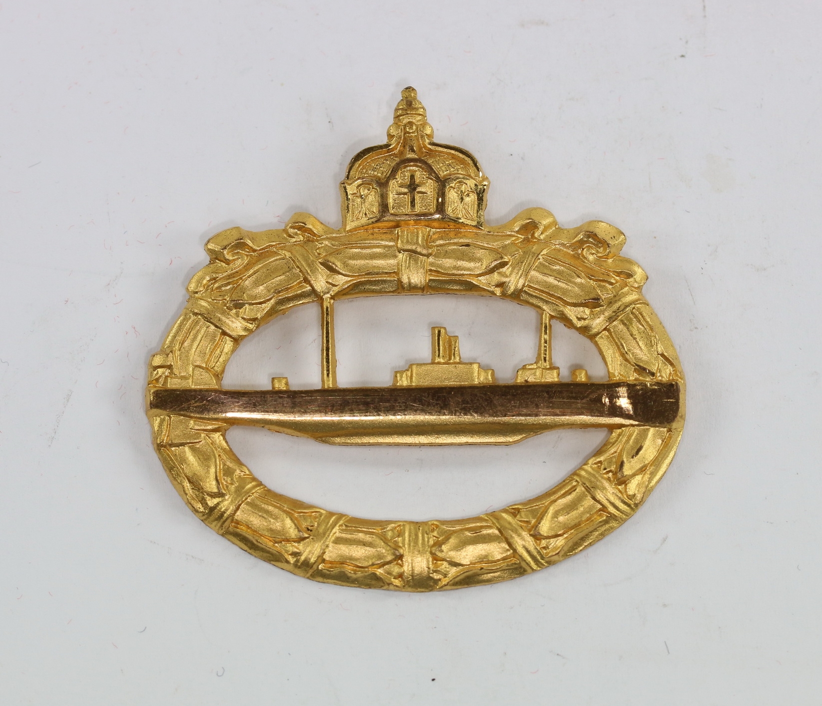Buntmetall hohl geprägt, excellenter, ungetragener Zustand. Mit vollständiger, strahlender Vergoldung. Mit polierten U-Boot und kanten. Ohne Hersteller, aber eine bekannte Variante der Firma W. Deumer, Lüdenscheid. Fertigung aus den 1920er Jahren.