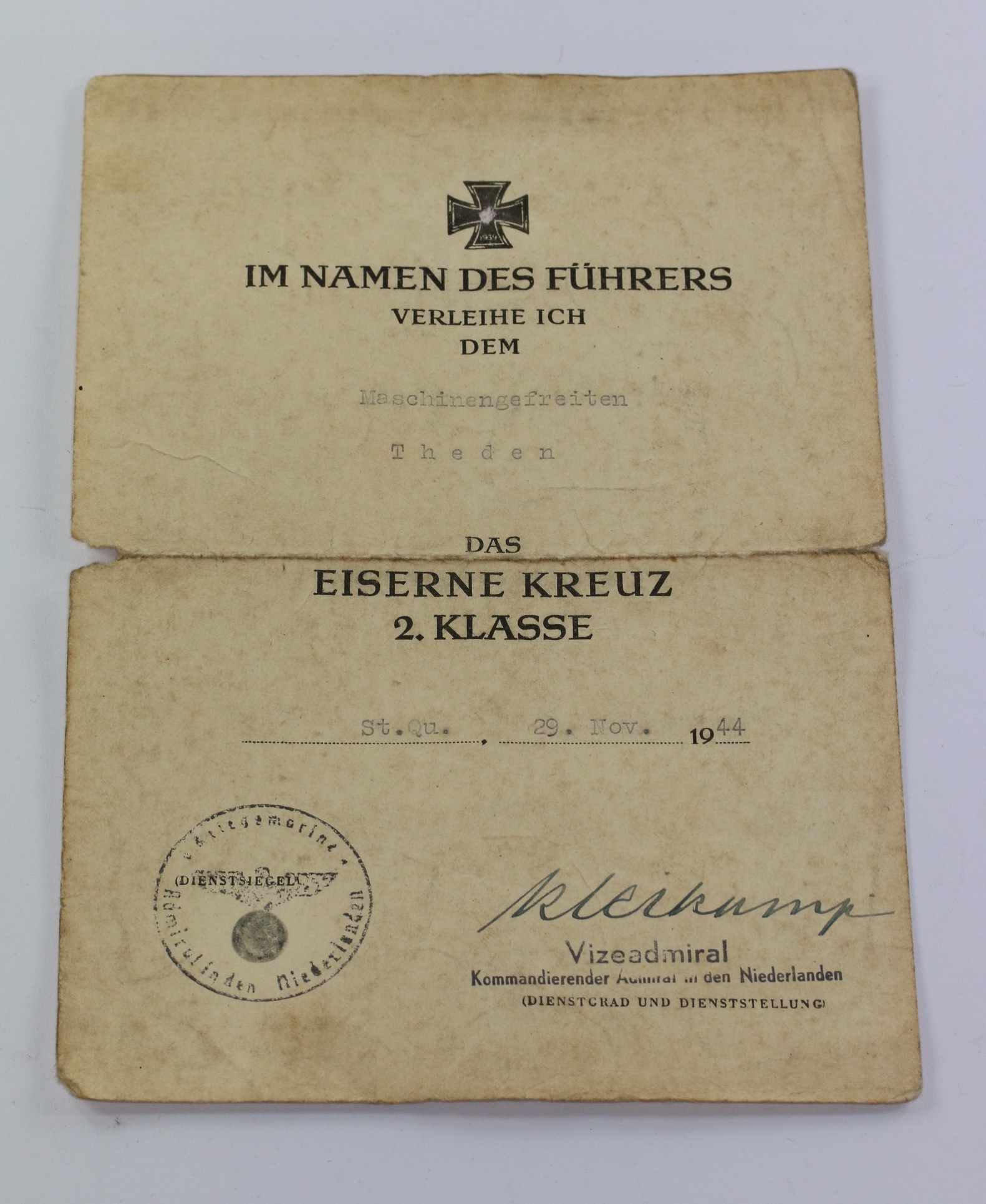 Document for the Iron Cross 2nd Class 1939. Kriegsmarine Holland.