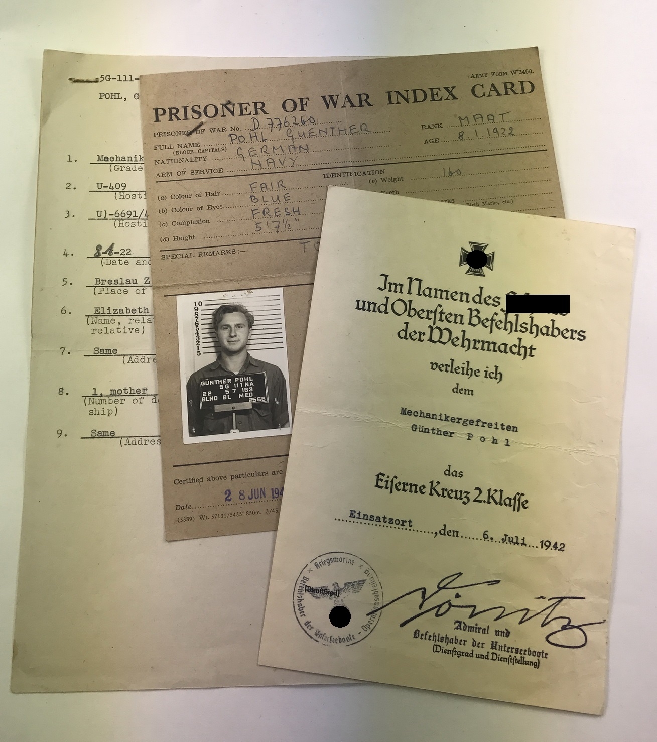 A small group of papers belonging to the Mechanikergefreiten Günther Pohl. Pohl served onboard U-409 for seven missions. The captain sank the boat himself after it was seriously damaged after fighting with a British ship in the Mediterranean on 12.7.1943. Most of the crew were killed but Kohl was one of the few survivors and was taken as a prisoner of war. Comprised of: