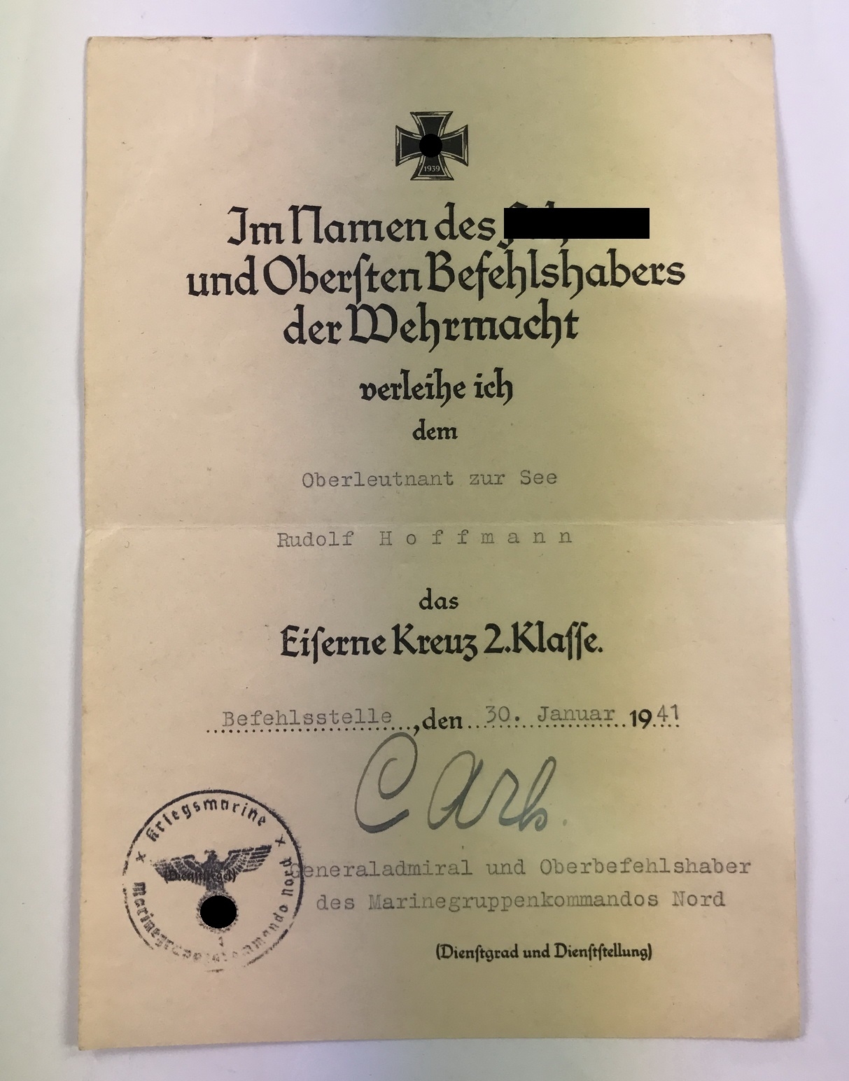 Document for the Iron Cross 2nd Class 1939 awarded to Oberleutnant zur See Rudolf Hoffmann. Ab 1.6.1942 Kommandant of U-8 and from 10.07.1943 Kommandant of U-845.