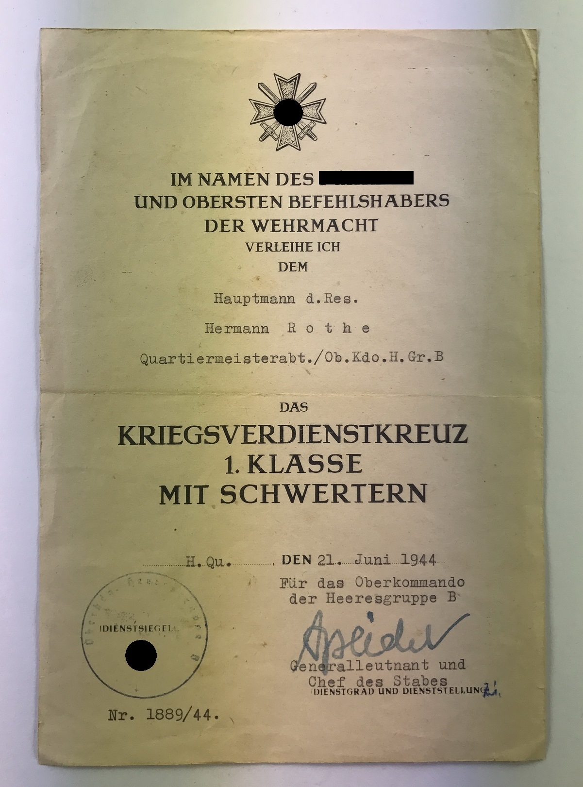Document for the War Merit Cross 1st Class with Swords, Oberkommando Heeresgruppe B.