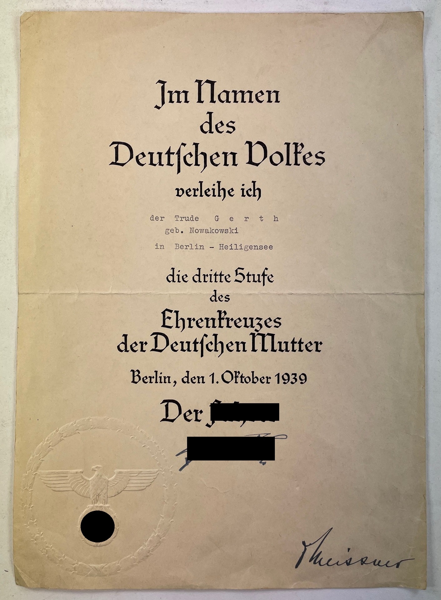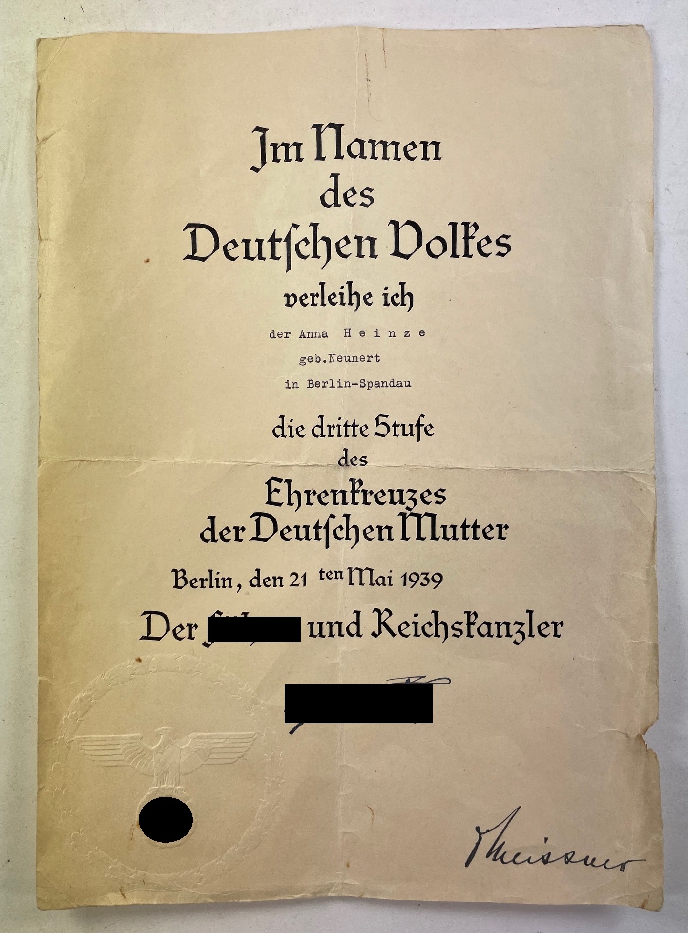 DIN-A4, serh guter, leicht gebrauchter Zustand. Mit Blindprägesiegel mit Hoheitsadler mit Hakenkreuz und faksimilierter Unterschrift Adolf Hitlers.