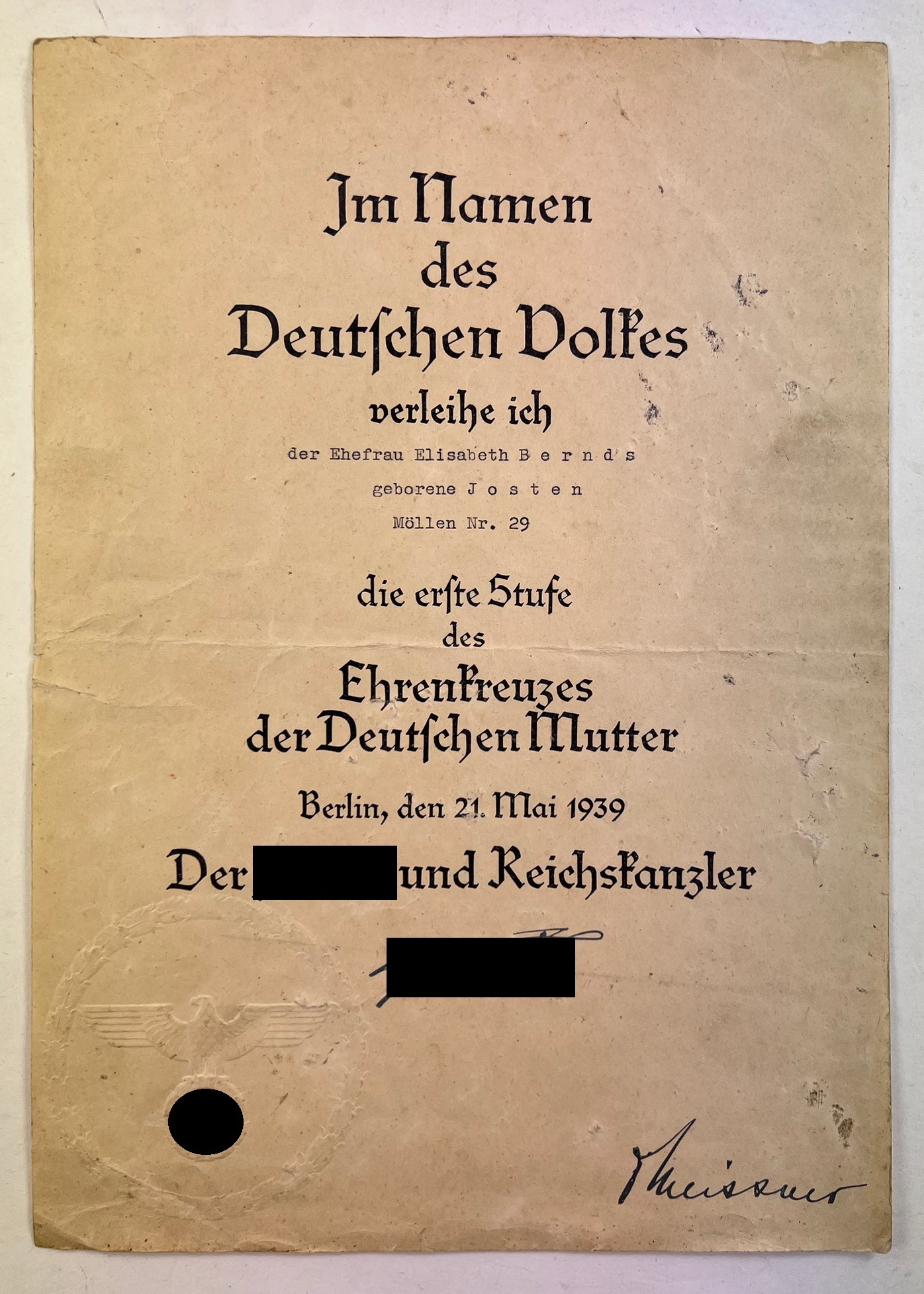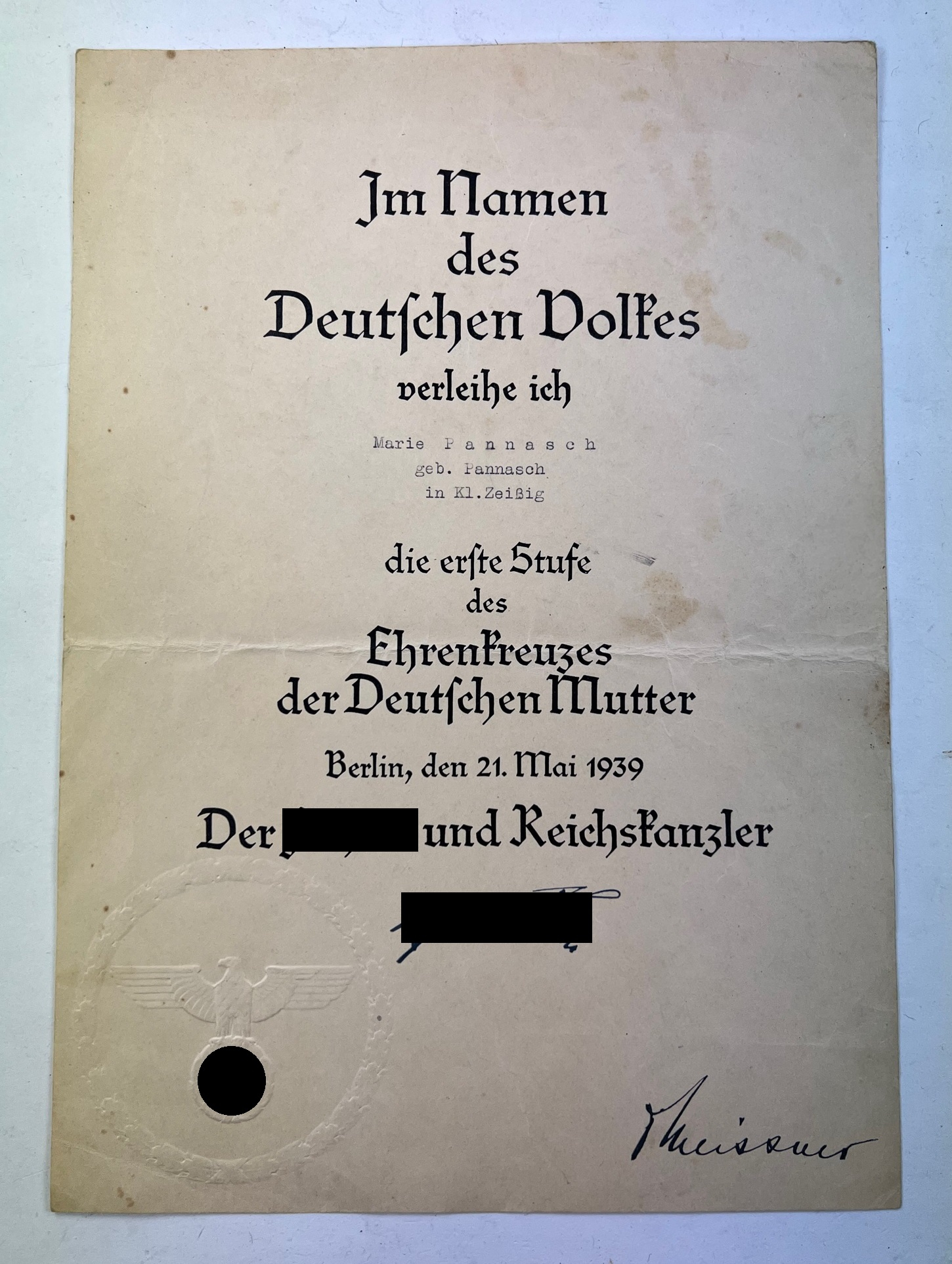 Large A4 size and in a very good, slightly used condition. With blind seal and facsimile signature Adolf Hitler.
