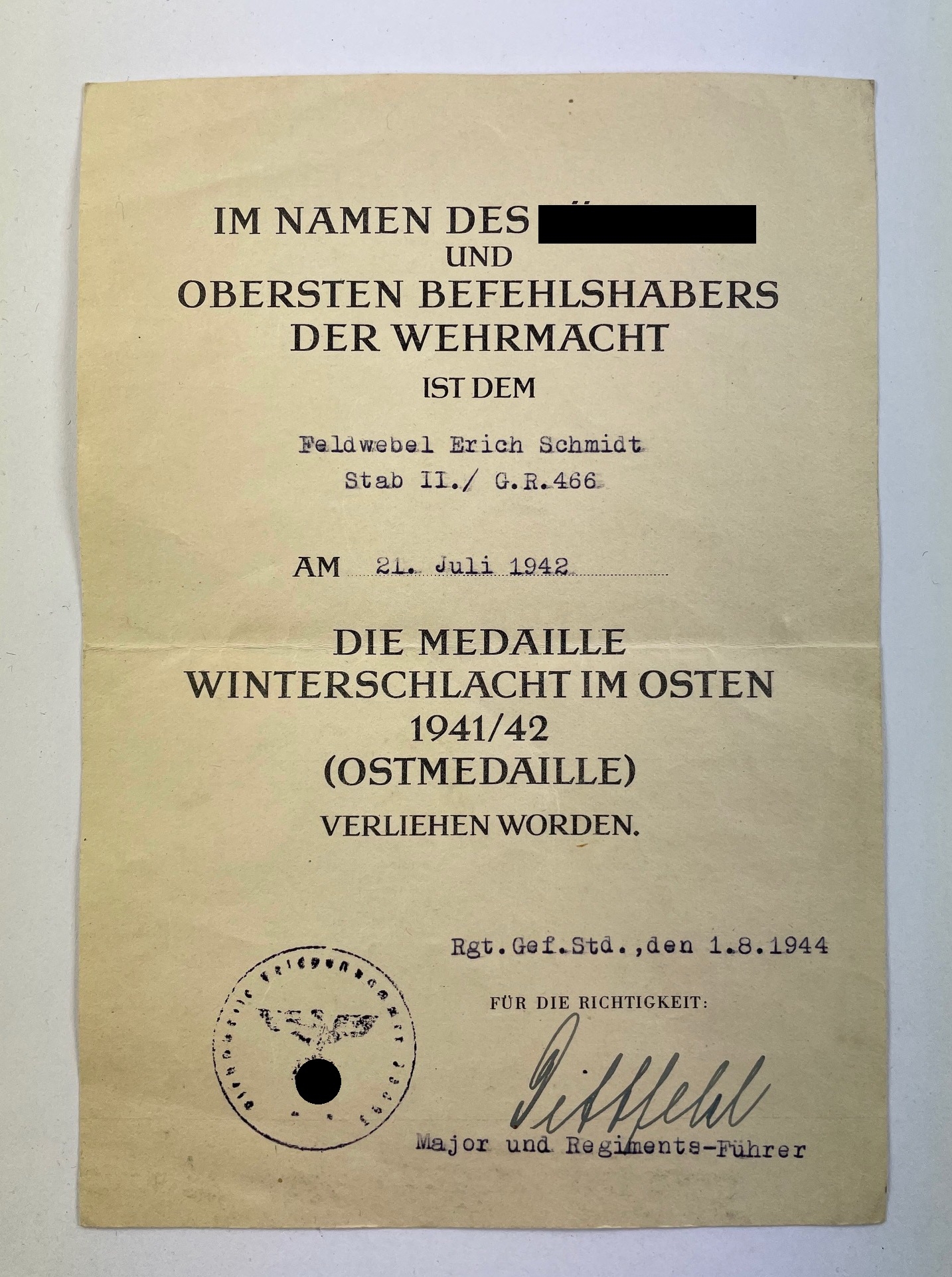 Document for the Eastern Front Medal, Grenadier Regiment 466