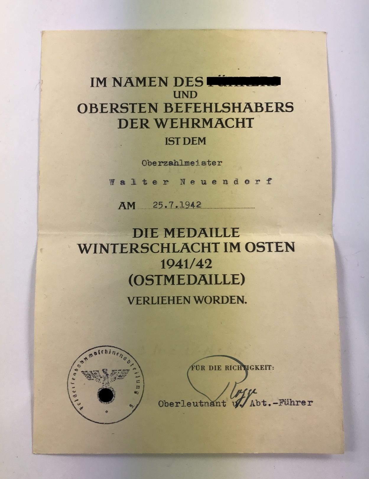 Awarded to Oberzahlmeister Walter Neuendorf.
