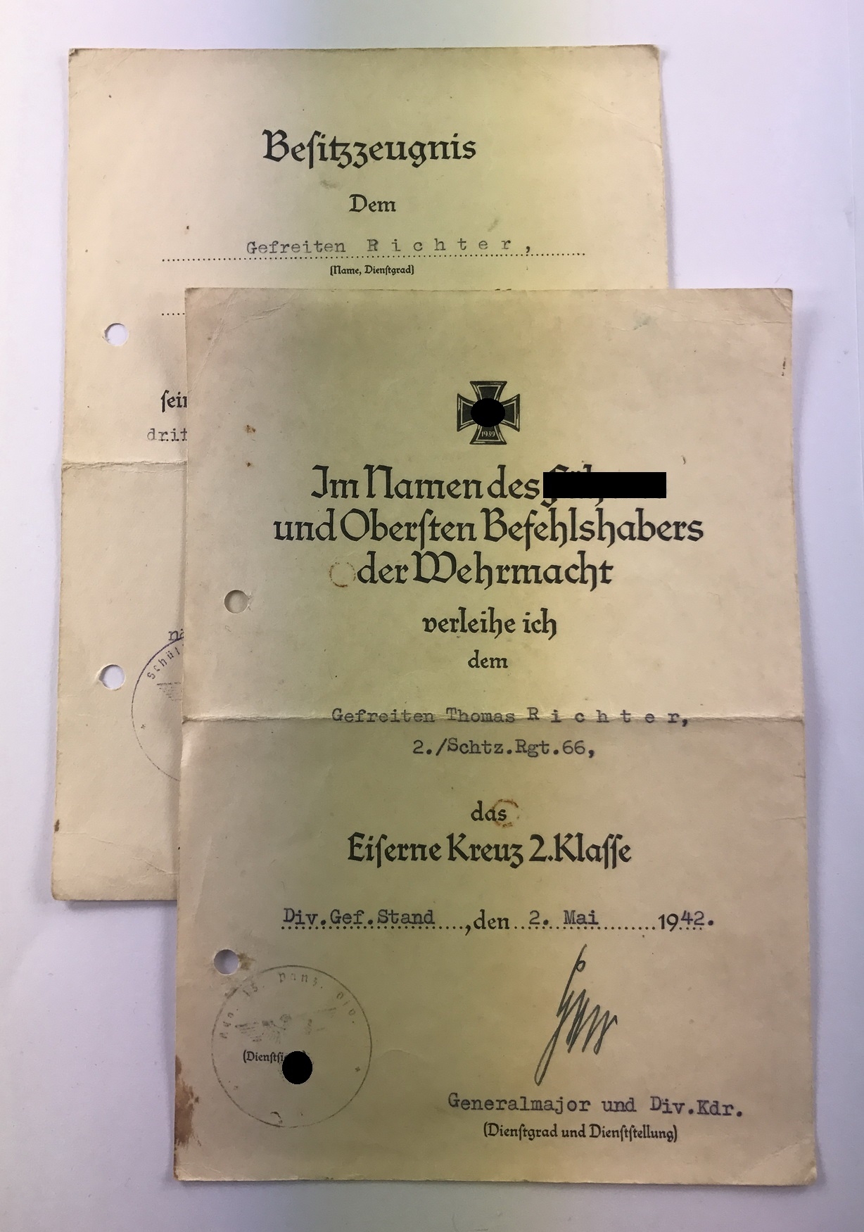 – Document for the Iron Cross 2nd Class 1939. In a somewhat used condition with signs of use and age. Original signature.