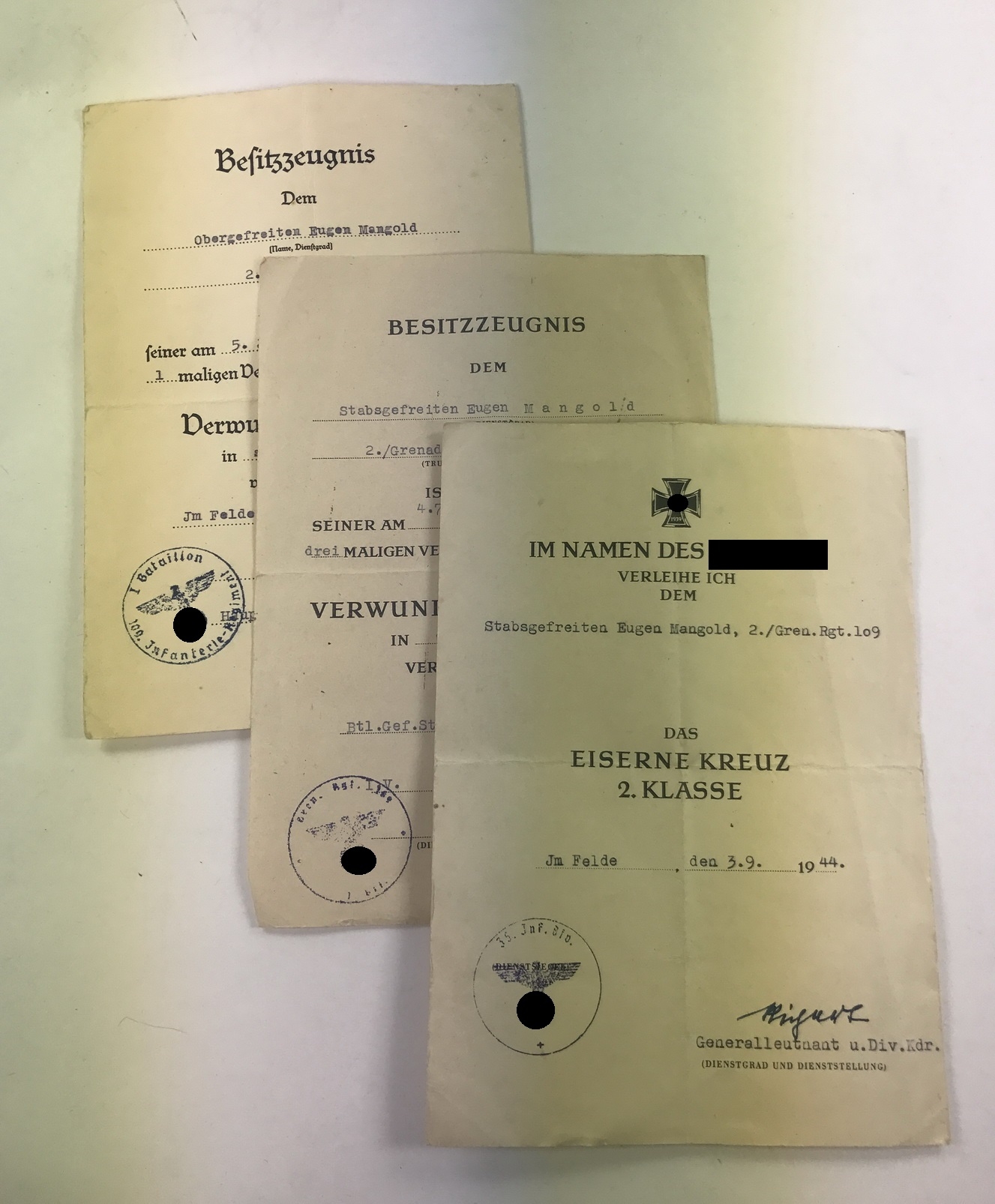 A small group of documents belonging to Eugen Mangold. He served with Infanterie, later Grenadier Regiment 109. All the documents in a good, slightly used condition. Comprised of: