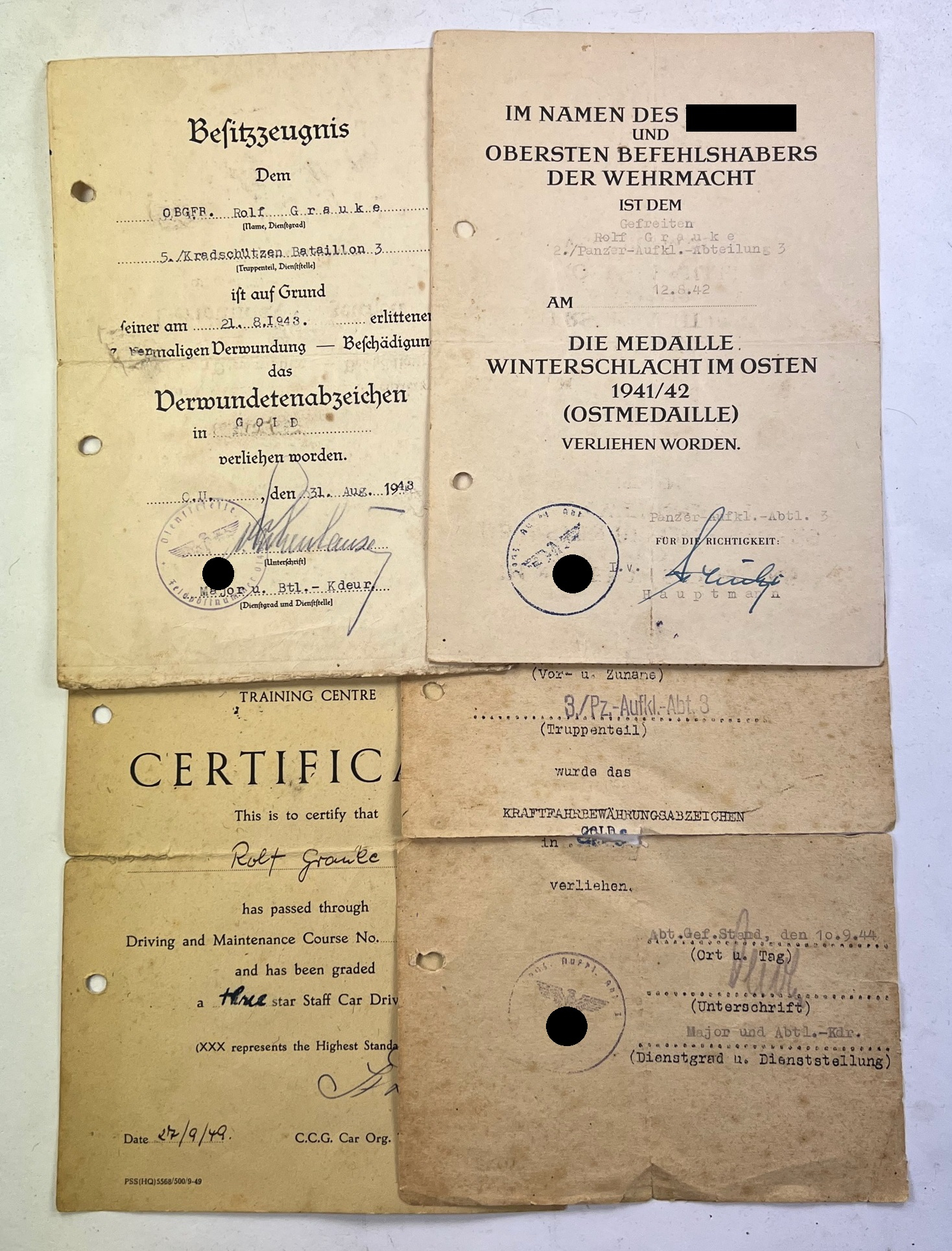 A group of documents from the possessions of the Obergefreiten Rolf Grauke. Grauke served as a driver with Panzeraufklärungsabteilung 3 and with Kradschützen Bataillon 3. All documents in a good, slightly used condition. Comprised of documents for: